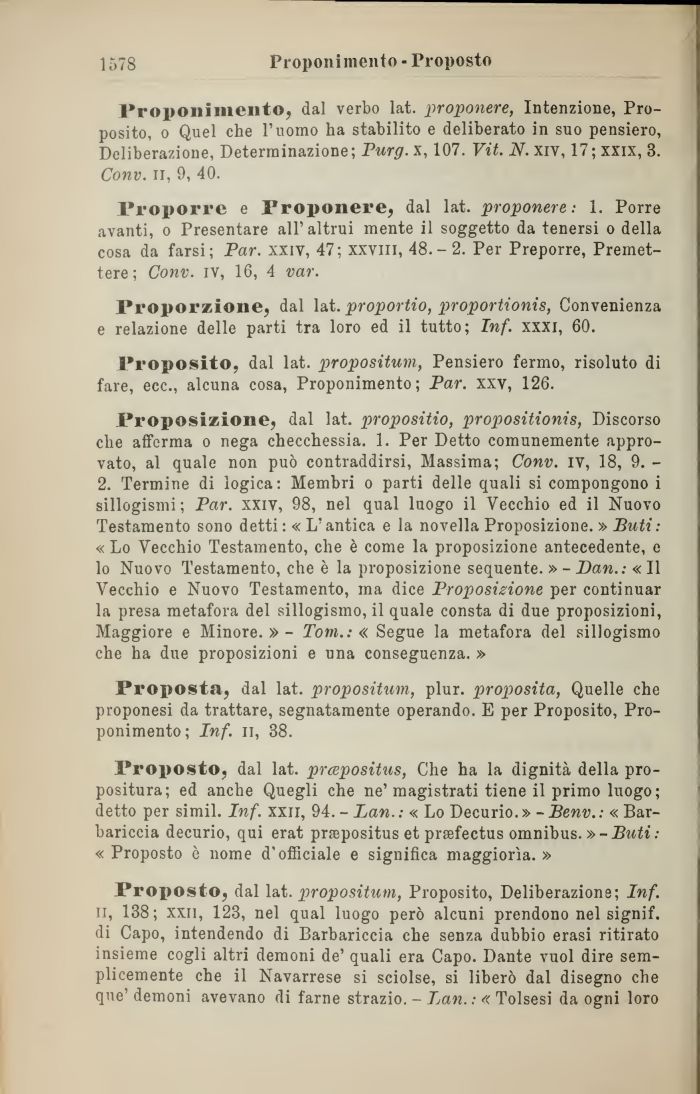 Proporre e Proponere, dal lat. proponere : 1. Porre avanti, o Presentare all' altrui mente il soggetto da tenersi o della cosa da farsi; Par. xxiv, 47; xxvm, 48.-2. Per Preporre, Premettere ; Conv. IV, 16, 4 var.