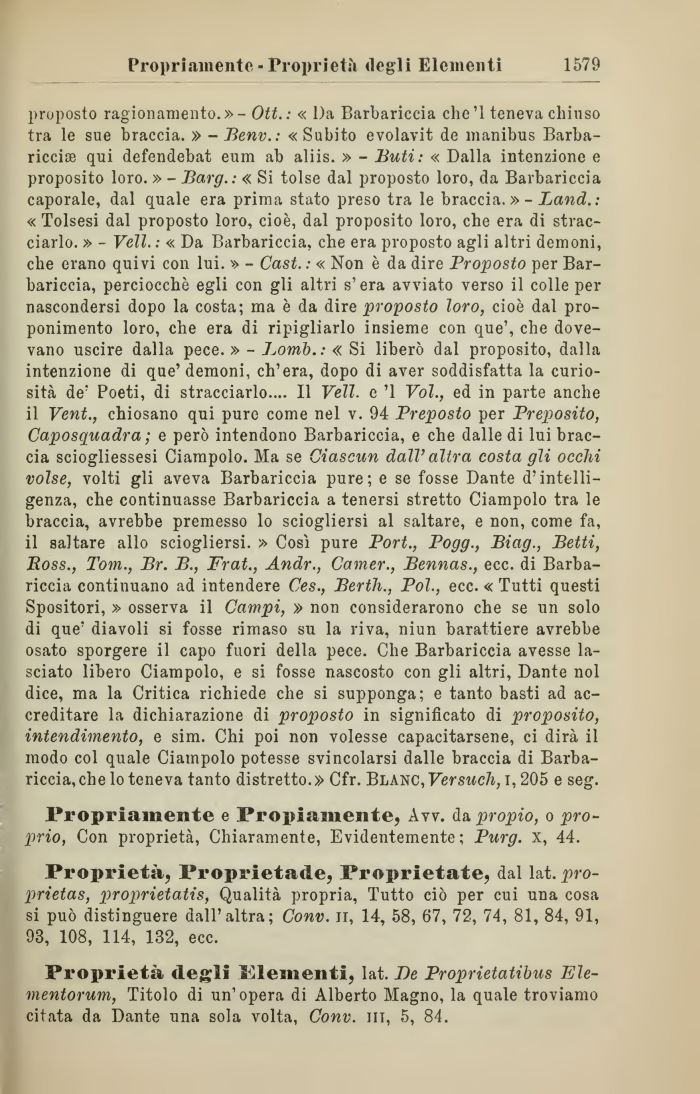 proposto ragionamento.» - Ott.: « Da Barbariccia che'l teneva chiuso tra le sue braccia. » - Benv.: « Subito evolavit de manibus Barba-riccise qui defendebat eum ab aliis. » - Buti: « Dalla intenzione e proposito loro. » - Barg.: « Si tolse dal proposto loro, da Barbariccia caporale, dal quale era prima stato preso tra le braccia. »- Land.: « Tolsesi dal proposto loro, cioè, dal proposito loro, che era di stracciarlo. » - Veli. : « Da Barbariccia, che era proposto agli altri demoni, che erano quivi con lui. » - Cast. : « Non è da dire Proposto per Barbariccia, perciocché egli con gli altri s'era avviato verso il colle per nascondersi dopo la costa; ma è da dire proposto loro, cioè dal proponimento loro, che era di ripigliarlo insieme con que', che dovevano uscire dalla pece. » - Lomb.: « Si liberò dal proposito, dalla intenzione di que'demoni, ch'era, dopo di aver soddisfatta la curiosità de' Poeti, di stracciarlo.... Il Veli, e '1 Voi., ed in parte anche il Vent., chiosano qui pure come nel v. 94 Preposto per Preposito, Caposquadra ; e però intendono Barbariccia, e che dalle di lui braccia sciogliessesi Ciampolo. Ma se Ciascun dall'altra costa gli occhi volse, volti gli aveva Barbariccia pure; e se fosse Dante d'intelligenza, che continuasse Barbariccia a tenersi stretto Ciampolo tra le braccia, avrebbe premesso lo sciogliersi al saltare, e non, come fa, il saltare allo sciogliersi. » Così pure Port., Pogg., Biag., Betti, Boss., Tom., Br. B., Frat., Andr., Camer., Bennas., ecc. di Barba-riccia continuano ad intendere Ces., Berth., Poi., ecc. « Tutti questi Spositori, » osserva il Campi, » non considerarono che se un solo di que' diavoli si fosse rimaso su la riva, niun barattiere avrebbe osato sporgere il capo fuori della pece. Che Barbariccia avesse lasciato libero Ciampolo, e si fosse nascosto con gli altri, Dante noi dice, ma la Critica richiede che si supponga; e tanto basti ad accreditare la dichiarazione di proposto in significato di proposito, intendimento, e sim. Chi poi non volesse capacitarsene, ci dirà il modo col quale Ciampolo potesse svincolarsi dalle braccia di Barba-riccia, che lo teneva tanto distretto.» Cfr. Ver sudi, i, 205 e seg.