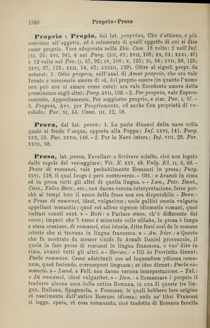 Prosa, lat. prosa, Favellare o Scrivere sciolto, cioè non legato dalle regole del verseggiare; Vit. N. xxv, 48. Vulg. El. li, 6, 66.-Prose di romanzi, vale probabilmente Romanzi in prosa; Purg. xxvi, 118, il qual luogo è però controverso. - Ott. : « Avanzò in rima ed in prosa tutti gli altri di quella lingua. » - Dan., Petr. Dant., Cass., Falso Bocc., ecc., non danno veruna interpretazione, forse perchè ai tempi loro il senso della frase non era disputabile. - Benv. : « Prose di romanzi, idest, vulgarium ; unde gallici omnia vulgaria appellant romantia; quod est adhuc signum idiomatis romani, quod imitali conati sunt. » - Buti: « Parlare steso, eh'è differente dal verso; imperò che'l verso è misurato colle sillabe, la prosa è lunga e stesa orazione, di romanzi, cioè istorie, ditte forsi così de le romane istorie che si trovano in lingua francesca. »- An. Pior. :« Questo che fu mostrato da messer Guido fu Arnalt Daniel provenzale, il quale in fare prose di romanzi in lingua francesca, o vuo' dire in rima, avanzò tutti gli altri. »- Serrav. : « Illi de Provintia dicunt: Parlo romanzo. Cesar adstrinxit eos ad loquendum ydioma roma-num, quod faciendo, corrumpunt linguam; et ideo dicunt: Parla romancio. » - Land, e Veli, non danno veruna interpretazione. - Tal.: « Di romanzi, idest vulgariter. »- Dan. : « Romanzare è proprio il tradurre alcuna cosa dalla antica Romana, in una di queste tre lingue, Italiana, Spagnuola, o Francese, le quali hebbero loro origine et nascimento dall'antico Romano idioma; onde ne' libri Francesi si legge, opera, et cosa romanzata, cioè tradotta di Romana favella