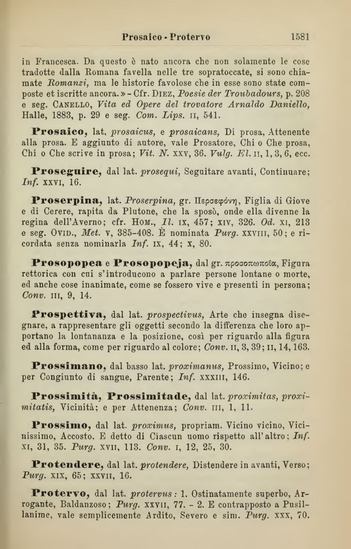 in Francesca. Da questo è nato ancora che non solamente le cose tradotte dalla Romana favella nelle tre sopratoccate, si sono chiamate Romanzi, ma le historie favolose che in esse sono state composte et iscritte ancora.» - Cfr. Diez, Poesie der Troubadours, p. 208 e seg. Canello, Vita ed Opere del trovatore Arnaldo Daniello, Halle, 1883, p. 29 e seg. Com. Lips. il, 541.