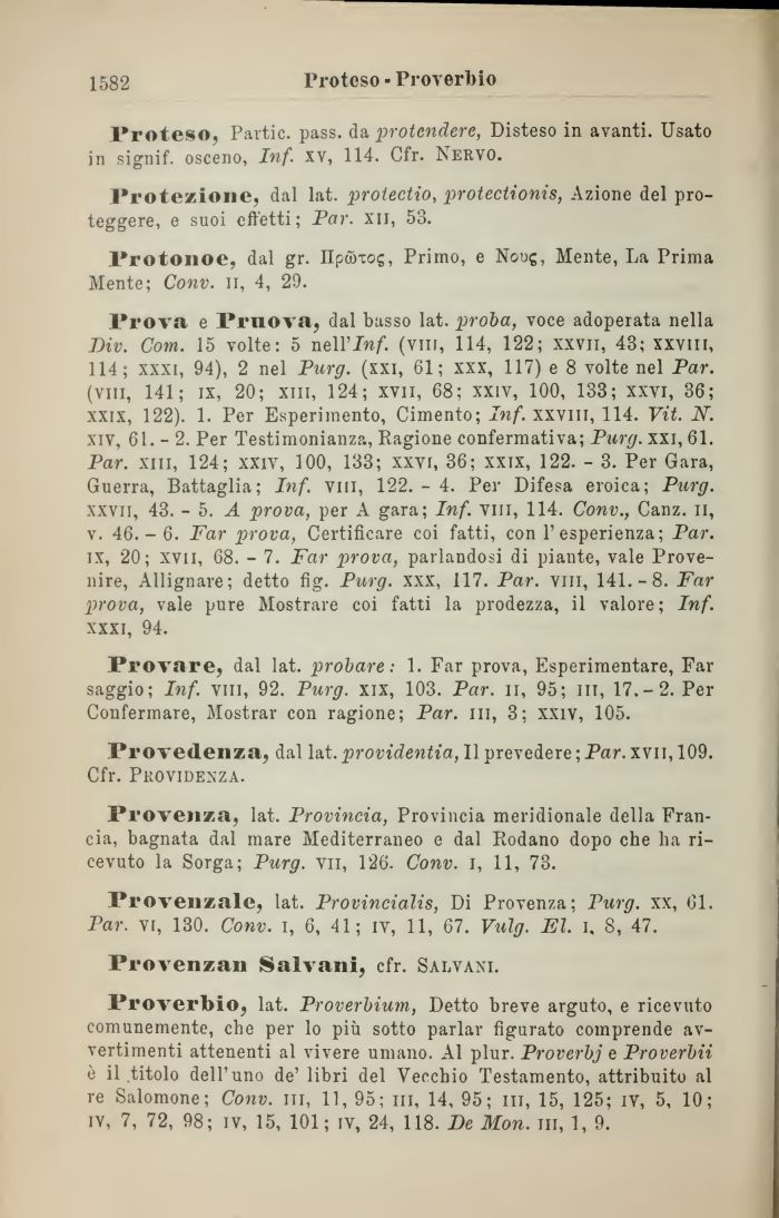 Prova e Pruova, dal basso lat. proba, voce adoperata nella Div. Com. 15 volte: 5 neWInf. (vili, 114, 122; xxvii, 43; xxviii, 114; xxxi, 94), 2 nel Purg. (xxi, 61; xxx, 117) e 8 volte nel Par. (vili, 141; ìx, 20; xiii, 124; xvn, 68; xxiv, 100, 133; xxvi, 36; xxix, 122). 1. Per Esperimento, Cimento; Inf. xxviii, 114. Vit. JV. xiv, 61.-2. Per Testimonianza, Ragione confermativa; Purg. xxi, 61. Par. xiii, 124; xxiv, 100, 133; xxvi, 36; xxix, 122. - 3. Per Gara, Guerra, Battaglia; Inf. vili, 122. - 4. Per Difesa eroica; Purg. xxvii, 43. - 5. A prova, per A gara; Inf. vili, 114. Conv., Canz. n, v. 46.- 6. Far prova, Certificare coi fatti, con l'esperienza; Par. ìx, 20; xvn, 68. - 7. Far prova, parlandosi di piante, vale Provenire, Allignare; detto fig. Purg. xxx, 117. Par. vili, 141.-8. Far prova, vale pure Mostrare coi fatti la prodezza, il valore; Inf. xxxi, 94.