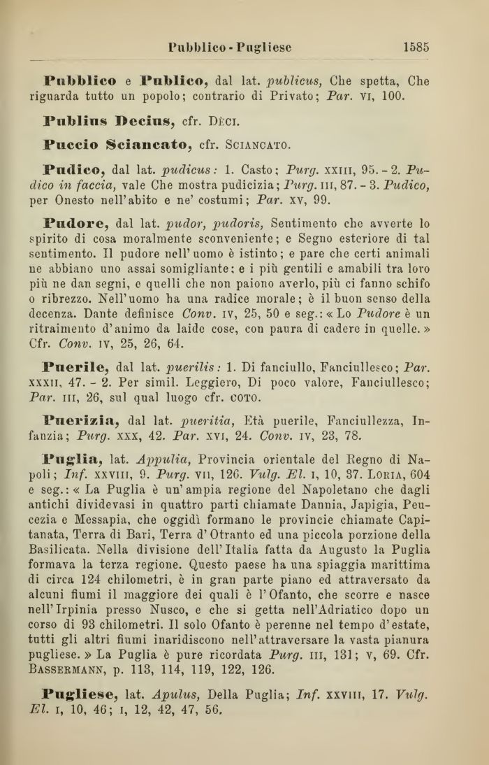 Puglia, lat. Appulia, Provincia orientale del Regno di Napoli ; Inf. xxvm, 9. Purg. vii, 126. Vulg. El. i, 10, 37. Loria, 604 e seg.:« La Puglia è un'ampia regione del Napoletano che dagli antichi dividevasi in quattro parti chiamate Dannia, Japigia, Peu-cezia e Messapia, che oggidì formano le Provincie chiamate Capitanata, Terra di Bari, Terra d'Otranto ed una piccola porzione della Basilicata. Nella divisione dell'Italia fatta da Augusto la Puglia formava la terza regione. Questo paese ha una spiaggia marittima di circa 124 chilometri, è in gran parte piano ed attraversato da alcuni fiumi il maggiore dei quali è 1' Ofanto, che scorre e nasce nell'Irpinia presso Nusco, e che si getta nell'Adriatico dopo un corso di 93 chilometri. Il solo Ofanto è perenne nel tempo d'estate, tutti gli altri fiumi inaridiscono nell'attraversare la vasta pianura pugliese. » La Puglia è pure ricordata Purg. in, 131; V, 69. Cfr. Bassermann, p. 113, 114, 119, 122, 126.