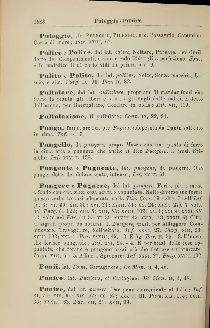Punire, dal lat. punire, Dar pena conveniente al fallo; Inf. xi, 74; xiv, 64; xix, 97; xx, 57; xxxiii, 81. Purg. xix, 114; xxlll, 36; xxxm, 63. Par. vii, 21; xvn, 99.