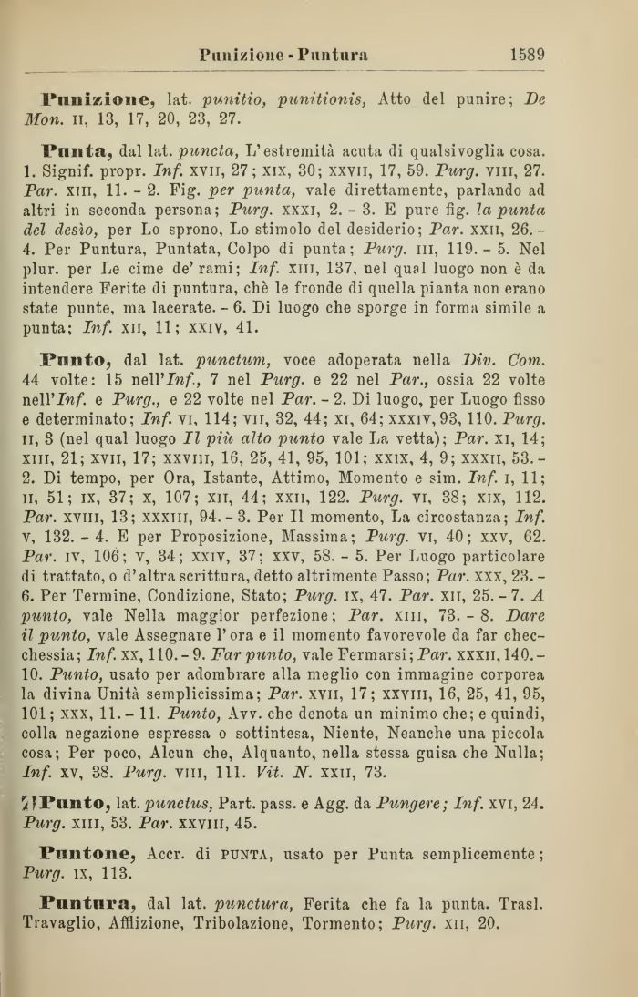2. Di tempo, per Ora, Istante, Attimo, Momento e sim. Inf. i, 11; il, 51; ix, 37; x, 107; xii, 44; xxii, 122. Purg. vi, 38; xix, 112. Par. xviii, 13; xxxm, 94.-3. Per II momento, La circostanza; Inf. v, 132. - 4. E per Proposizione, Massima; Purg. vi, 40; xxv, 62. Par. ìv, 106; v, 34; xxiv, 37; xxv, 58. - 5. Per Luogo particolare di trattato, o d'altra scrittura, detto altrimente Passo; Par. xxx, 23. -6. Per Termine, Condizione, Stato; Purg. ix, 47. Par. xii, 25. - 7. A punto, vale Nella maggior perfezione ; Par. xm, 73. - 8. Dare il punto, vale Assegnare l'ora e il momento favorevole da far checchessia; Inf. xx, 110.-9. Far punto, vale Fermarsi; Par. xxxii, 140.-10. Punto, usato per adombrare alla meglio con immagine corporea la divina Unità semplicissima; Par. xvn, 17; xxviii, 16, 25, 41, 95, 101 ; xxx, 11. - 11. Punto, Avv. che denota un minimo che; e quindi, colla negazione espressa o sottintesa, Niente, Neanche una piccola cosa; Per poco, Alcun che, Alquanto, nella stessa guisa che Nulla; Inf. xv, 38. Purg. vili, 111. Vit. N. xxii, 73.
