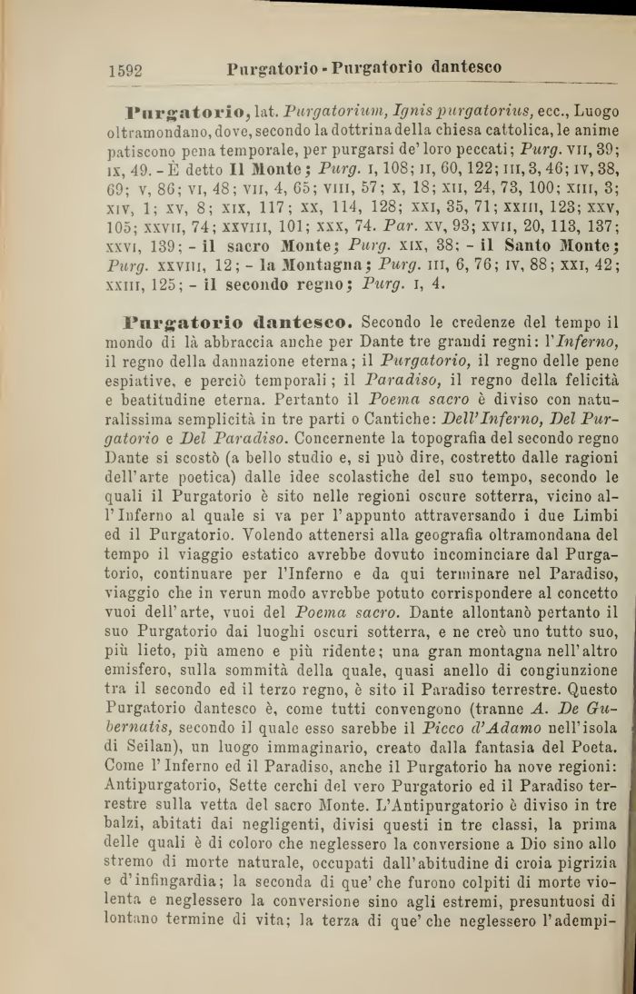 I*nrgatorio, lat. Purgatorium, Ignis purgatorius, ecc., Luogo oltramondano, dove, secondo la dottrina della chiesa cattolica, le anime patiscono pena temporale, per purgarsi de' loro peccati ; Purg. vii, 39; ix, 49.-È detto II Monte; Purg. i, 108; n, 60,122; in,3, 46; iv, 38, 69; v, 86; vi, 48; vii, 4, 65; vili, 57; x, 18; xii, 24, 73, 100; xm, 3; xiv, 1; xv, 8; xix, 117; xx, 114, 128; xxi, 35, 71 ; xxiii, 123; xxv, 105; xxvii, 74; xxvhi, 101; xxx, 74. Par. xv, 93; xvii, 20, 113, 137; xxvi, 139; - il sacro Monte; Purg. xix, 38; - il Santo Monte; Purg. xxvm, 12; - la 3Iontagna; Purg. ni, 6, 76; iv, 88; xxi, 42; xxiii, 125; - il secondo regno; Purg. i, 4.