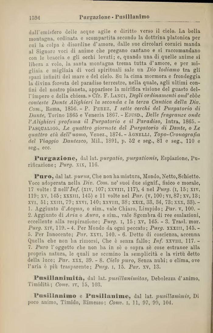 Puro, dal lat. purus, Che non ha mistura, Mondo, Netto, Schietto. Voce adoperata nella Div. Com. ne' suoi due signif., fisico e morale, 17 volte: 2 nell'In/', (xiv, 107; xxviii, 117), 4 nel Purg. (i, 15; xiv, 119; xv, 145; xxxm, 145) e 11 volte nel Par. (v, 100; vi, 87; xv, 13; xvi, 51; xxiii, 79; xxvi, 140; xxviii, 38; xxix, 33, 34, 73; xxx, 33).-