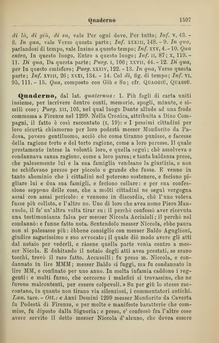 di là, di giù, di su, vale Per ogni dove, Per tutto; Inf. v, 43. -8. In qua, vale Verso questa parte; Inf. xxxm, 148.-9. In qua, parlandosi di tempo, vale Insino a questo tempo; Inf. xxv, 4.-10. Qua entro, In questo luogo, Entro a questo luogo; Inf. n, 87; x, 119.-11. Di qua, Da questa parte; Purg. i, 106; xxvn, 44.-12. Di qua, per In questo emisfero; Purg. xxxiv, 122. - 13. In qua, Verso questa parte; Inf. xviii, 26; xxxi, 134. - 14. Col dì, fig. di tempo; Inf. vi, 95, 111. - 15. Qua, composto con Giù e Su; cfr. Quaggiù, Quassù.
