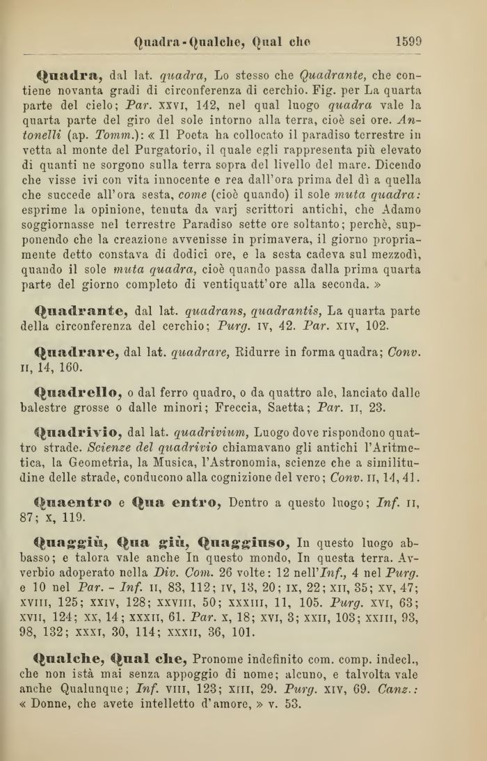 Quadra, dal lat. quadra, Lo stesso che Quadrante, che contiene novanta gradi di circonferenza di cerchio. Fig. per La quarta parte del cielo; Par. xxvi, 142, nel qual luogo quadra vale la quarta parte del giro del sole intorno alla terra, cioè sei ore. An-toneìli (ap. Tomm.): « Il Poeta ha collocato il paradiso terrestre in vetta al monte del Purgatorio, il quale egli rappresenta più elevato di quanti ne sorgono sulla terra sopra del livello del mare. Dicendo che visse ivi con vita innocente e rea dall'ora prima del dì a quella che succede all'ora sesta, come (cioè quando) il sole muta quadra: esprime la opinione, tenuta da varj scrittori antichi, che Adamo soggiornasse nel terrestre Paradiso sette ore soltanto; perchè, supponendo che la creazione avvenisse in primavera, il giorno propriamente detto constava di dodici ore, e la sesta cadeva sul mezzodì, quando il sole muta quadra, cioè quando passa dalla prima quarta parte del giorno completo di ventiquatt'ore alla seconda. »
