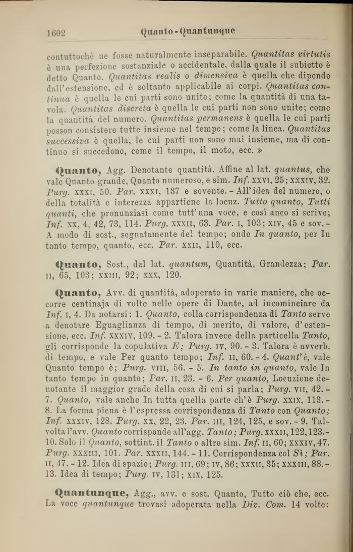 Quanto, Avv. di quantità, adoperato in varie maniere, che occorre centinaja di volte nelle opere di Dante, ad incominciare da Inf. i, 4. Da notarsi: 1. Quanto, colla corrispondenza di Tanto serve a denotare Eguaglianza di tempo, di merito, di valore, d'estensione, ecc. Inf. xxxiv, 109. - 2. Talora invece della particella Tanto, gli corrisponde la copulativa E; Purg. iv, 90. - 3. Talora è avverb. di tempo, e vale Per quanto tempo; Inf. Il, 60.-4. Quant'è, vale Quanto tempo è; Purg. vili, 56. - 5. In tanto in quanto, vale In tanto tempo in quanto; Par. n, 23. - 6. Per quanto, Locuzione denotante il maggior grado della cosa di cui si parla; Purg. vii, 42.-