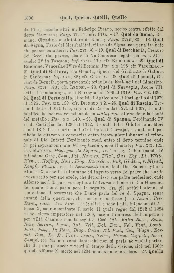 da Pisa, secondo altri un Federigo Pisano, ucciso contra effetto dal detto Marzucco; Purg. vi, 17; cfr. Pisa. - 17. Quel da Roma, Romano, Cittadino o Abitatore di Roma; Purg. xvni, 80. -18. Quel da Signa, Fazio dei Morubaldini, villano da Signa, non per altro noto che per sue baratterie; Par. xvi, 56.-19. Quel dì Beccheria, Tesauro dei Beccheria, pavese, abate di Vallombrosa, legato per papa Alessandro IV in Toscana; Inf. xxxn, 119; cfr. Beccheria. - 20. Quel di Buemme, Venceslao IV re di Boemia; Par. xix, 125; cfr. Vincislao.-21. Quel di Gallura, Fra Gomita, signore del Giudicato di Gallura in Sardegna; Inf. xxn, 82; cfr. Gomita. - 22. Quel di Lemosì, Gi-rant de Bornelh, poeta provenzale oriundo da Essidueil nel Limosino; Purg. xxvi, 120; cfr. Lemosì. - 23. Quel di Norvegia, Acone VII, detto il Gambalunga, re di Norvegia dal 1299 al 1319 ; Par. xix, 139. -24. Quel di Portogallo, Dionisio l'Agricola re di Portogallo dal 1279 al 1325; Par. xix, 139; cfr. Dionisio § 2.-25. Quel di Rascia, Uro-sio I detto il Milutino, signore di Rascia dal 1275 al 1307, il quale falsificò la moneta veneziana detta matapano, alterandone la bontà del metallo; Par. xix, 140.- 26. Quel di Spagna, Ferdinando IV re di Castiglia dal 1295 al 1312, il quale tolse Gibilterra ai Mori e nel 1312 fece morire a torto i fratelli Carvajal, i quali sul patibolo lo citarono a comparire entro trenta giorni dinanzi al tribunale di Dio. Infatti Ferdinando morì entro il detto termine, onde fu poi soprannomiuato El emplazado, cioè II citato; Par. xix, 125. Cfr. Mariana, Hist. gen. de Espana, xv, 1 e seg. Di Ferdinando IV intendono Greg., Cam., Poi., Kanneg., Filai., Gus., Kop., Bl., Witte, Eitn., v. Hoffmg., Nott., Krig., Bartsch, v. Enk, Gildem., v. Mijud., Longf., Plump., ecc. 11 Bennassuti intende di Don Sancio figlio di Alfonso X, « che fu sì inumano ed ingrato verso del padre che pur lo aveva scelto per suo erede, che detronizzò suo padre medesimo, onde Alfonso morì di puro cordoglio. » L'erotta; intende di Don Giacomo, del quale Dante parla però in seguito. Tra gli antichi alcuni si contentano di osservare che Dante parla del re di Spagna, senza curarsi della questione, chi questo re si fosse (così Land., Petr. Dant., Cass., An. Fior., ecc.); altri, e sono i più, intendono di Alfonso X, soprannominato il savio, il quale regnò dal 1252 al 1284 e che, eletto imperatore nel 1260, lasciò l'impresa dell'imperio e per viltà d'animo non la seguitò. Così Ott., Falso Bocc., Benv., Buti, Serrav., Land., Tal., Veli., Boi., Dan., Voi., Vent., Lomb., Port., Pogg., De Bom., Biag., Costa, Ed, Pad., Ces., Wagn., Borghi, Tom., Br. B., Frat., Andr., Triss., Frane., Cappell, Bocci, Campi, ecc. Ma nei versi danteschi non si parla nè vuoisi parlare che di principi ancor viventi al tempo della visione, cioè nel 1300; quindi Alfonso X, morto nel 1284, non ha qui che vedere. - 27. Quella
