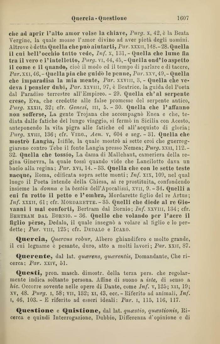 clic ad aprir l'alto amor volse la chiave, Purg. x, 42, ò la Beata Vergine, la quale mosse l'amor divino ad aver pietà degli uomini. Altrove è detta Quella che può aiutarti, Par. xxxii, 148.-28. Quella il cui bell'occhio tutto vede, Inf. x, 131,-Quella che lume fi a tra il vero e l'intelletto, Purg. vi, 44, 45,-Quella ond'io aspetto il come e il quando, cioè il modo ed il tempo di parlare e di tacere, Par. xxi, 46, - Quella pia che guidò le penne, Par. xxv, 49,- Quella che imparadisa la mia niente, Par. xxviii, 3, - Quella che vedeva i pensier dubì, Par. xxviii, 97, è Beatrice, la guida del Poeta dal Paradiso terrestre all'Empireo. - 29. Quella ch'ai serpente crese, Eva, che credette alle false promesse del serpente antico, Purg. xxxii, 32; cfr. Genesi, ni, 5.-30. Quella che l'affanno non sofferse, La gente Trojana che accompagnò Enea e che, tediata dalle fatiche del lungo viaggio, si. fermò in Sicilia con Acesto, anteponendo la vita pigra alle fatiche ed all'acquisto di gloria; Purg. xviii, 136; cfr. Viro., Aen. v, 604 e seg. - 31. Quella che mostrò Langìa, Isifìle, la quale mostrò ai sette eroi che guerreggiarono contro Tebe il fonte Langìa presso Nemea; Purg. xxn, 112.-32. Quella che tossio, La dama di Mallehaut, cameriera della regina Ginevra, la quale tossì quando vide che Lancilotto dava un bacio alla regina; Par. xvi, 14. -33. Quella che con le sette teste nacque, Roma, edificata sopra sette monti ; Inf. xix, 109, nel qual luogo il Poeta intende della Chiesa, ai re prostituita, confondendo insieme la donna e la bestia dell'Apocalissi, xvn, 9.-34. Quelli a cui fu rotto il petto e l'ombra, Mordarette figlio del re Artus ; Inf. xxxii, 61 ; cfr. Mordarette. - 35. Quelli che diede al re Giovanni i mai conforti, Bertram dal Bornio; Inf. xxviii, 134; cfr. Bertram dal Bornio. - 36. Quello che volando per l'aere il figlio pèrse, Dedalo, il quale insegnò a volare al tìglio e lo perdette; Par. vni, 125; cfr. Dedalo e Icaro.