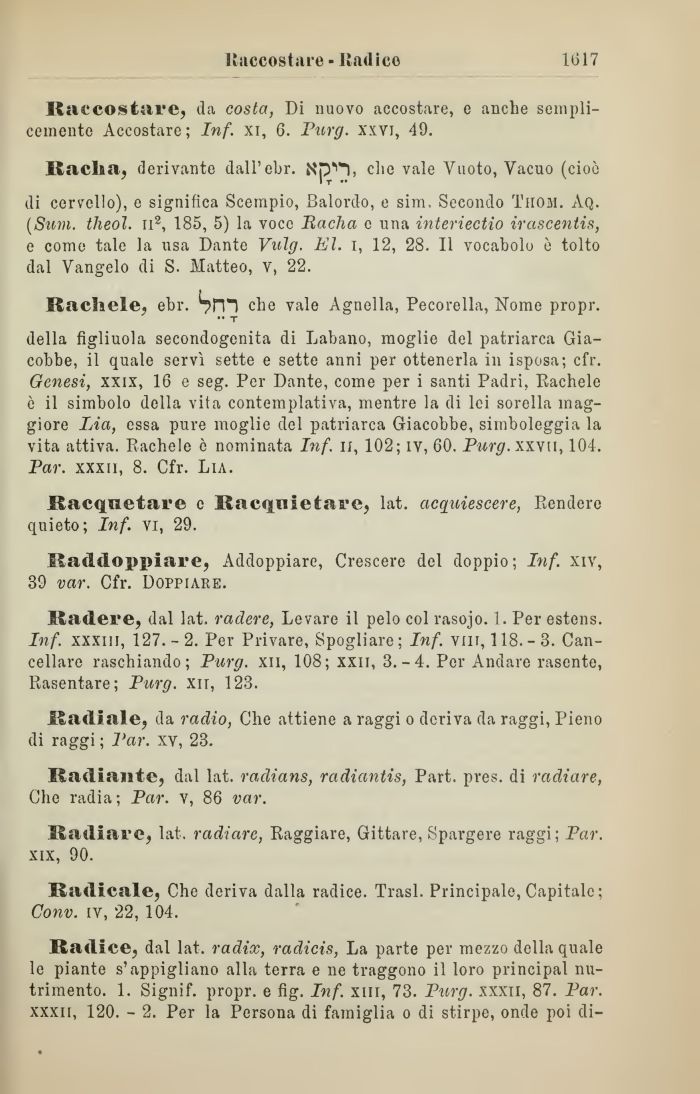Radice, dal lat. radix, radicis, La parte per mezzo delinquale le piante s'appigliano alla terra e ne traggono il loro principal nutrimento. 1. Signif. propr. e fig. Inf. xm, 73. Purg. xxxii, 87. Par. xxxii, 120. - 2. Per la Persona di famiglia o di stirpe, onde poi di-