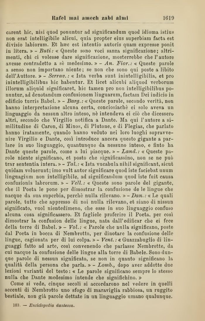 carent hic, nisi quod ponuntur ad significandum quod idioma istius non erat intelligibile alicui, quia propter eius superbiam facta est divisio labiorum. Et hsec est intentio autoris quam expresse ponit in litera. »- Buti : « Queste sono voci sanza significazione; altrimenti, chi ci volesse dare significazione, mosterrebbe che 1' autore avesse contradetto a sè medesimo. » - An. Fior.: « Queste parole a senso non importano niente; se non che sono qui poste a libito dell'Auttore. » - Serrav.: « Ista verba sunt inintelligibilia, et prò inintelligibilibus hic habentur. Et licet alicubi aliquod verborum illorum aliquid significaret, hic tamen prò non intelligibilibus ponuntur, ad denotandum confusionem linguarum, factam Dei indicio in edificio turris Babel. » - Barg.: « Queste parole, secondo verità, non hanno interpretazione alcuna certa, conciosiacliè ei solo aveva un linguaggio da nessun altro inteso, nè intendeva ei ciò che dicessero altri, secondo che Virgilio notifica a Dante. Ma qui l'autore a similitudine di Caron, di Minos, di Plutone, e di Flegias, che parlato hanno iratamente, quando hanno veduto nei loro luoghi sopravvenire Virgilio e Dante, così introduce ancora questo gigante a parlare in suo linguaggio, quantunque da nessuno inteso, e fìnto ha Dante queste parole, come a lui piacque. »- Land. :« Queste parole niente significano, et posto che significassino, non se ne può trar sententia intera. » - Tal. : « Ista vucabula nihil significant, sicut quidam voluerunt; imo vult autor significare quod iste faciebat unum linguagium non intelligibile, ad significandum quod iste fuit causa confusionis labrorum. » - Veli. : « Queste sono parole del gigante, che il Poeta le pone per dimostrar la confusione de le lingue che nacque da sua superbia, perchè nulla rilevano. » - Dan. : « Le quali parole, tutto che appresso di noi nulla rilevano, et siano di nissun significato, vuol nientedimeno, che esse in suo linguaggio confuso alcuna cosa significassero. Et fagliele proferire il Poeta, per così dimostrar la confusion delle lingue, nata dall'edificar che ei fece della torre di Babel. » - Voi.: « Parole che nulla significano, poste dal Poeta in bocca di Nembrotto, per dinotare la confusione delle lingue, cagionata per di lui colpa. » - Vent. : « Guazzabuglio di linguaggi fatto ad arte, così convenendo che parlasse Nembrotte, da cui nacque la confusione delle lingue alla torre di Babele. Sono dunque parole di nessun significato, se non in quanto significano la qualità della persona che parla. » - Lomb., dopo aver addotte due lezioni varianti del testo : « Le parole significano sempre lo stesso nulla che Dante medesimo intende che significhino. »