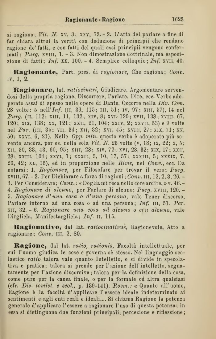 Ragionare, lat. ratiocinari, Giudicare, Argomentare servendosi della propria ragione, Discorrere, Parlare, Dire, ecc. Verbo adoperato assai di spesso nelle opere di Dante. Occorre nella Div. Com. 28 volte: 5 neWInf. (n, 36, 115; in, 51; iv, 07; xm, 57), 14 nel Purg. (n, 112; xm, 11, 132; xiv, 8; xvi, 120; xvii, 138; xvm, 67, 120; xix, 138; xx, 121; xxii, 21, 104; xxiv, 2; xxvii, 53) e 9 volte nel Par. (in, 35; vii, 34; xll, 32; xvi, 45; xviii, 27; xix, 71; xx, 50; xxvi, 6, 21). Nelle Opp. min. questo verbo č adoperato pił sovente ancora, per es. nella sola Vit. N. 25 volte (v, 18; ix, 22; x, 5; xii, 30, 33, 43, 60, 95; xm, 28; xiv, 72; xvi, 23, 32; xix, 17; xxu, 28; xxiii, 104; xxvi, 1; xxxii, 5, 10, 17, 57; xxxm, 5; xxxix, 7, 20, 42; xl, 15), ed in proporzione nelle Rime, nel Conv., ecc. Da notarsi: 1. Ragionare, per Filosofare per trovar il vero; Purg. xviii, 67.-2. Per Dichiarare a forza di ragioni; Conv. ni, 12, 2, 3, 26. -
