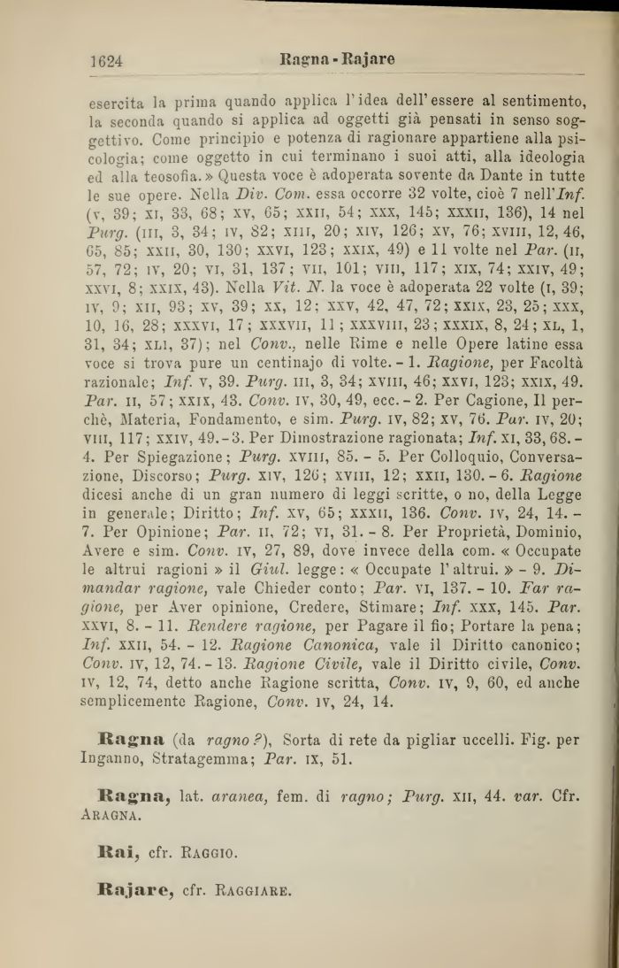 esercita la prima quando applica l'idea dell'essere al sentimento, la seconda quando si applica ad oggetti già pensati in senso soggettivo. Come principio e potenza di ragionare appartiene alla psicologia; come oggetto in cui terminano i suoi atti, alla ideologia ed alla teosofia.» Questa voce è adoperata sovente da Dante in tutte le sue opere. Nella Div. Com. essa occorre 32 volte, cioè 7 neWInf. (v, 39; xi, 33, 68; xv, 65; xxii, 54; xxx, 145; xxxn, 136), 14 nel Purg. (ìli, 3, 34; iv, 82; xiii, 20; Xiv, 126; xv, 76; xvm, 12,46, 65, 85; xxii, 30, 130; xxvi, 123; xxix, 49) e 11 volte nel Par. (ir, 57, 72; iv, 20; vi, 31, 137; vii, 101; vili, 117; xix, 74; xxiv, 49; xxvi, 8; xxix, 43). Nella Vit. N. la voce è adoperata 22 volte (i, 39; iv, 9; xn, 93; xv, 39; xx, 12; xxv, 42, 47, 72; xxix, 23, 25; xxx, 10, 16, 28; xxxvi, 17; xxxvn, 11 ; xxxvm, 23; xxxix, 8, 24; xl, 1, 31, 34; xli, 37); nel Conv., nelle Rime e nelle Opere latine essa voce si trova pure un centinajo di volte.-1. Ragione, per Facoltà razionale; Inf. v, 39. Purg. in, 3, 34; xvm, 46; xxvi, 123; xxix, 49. Par. n, 57; xxix, 43. Conv. iv, 30,49, ecc.-2. Per Cagione, Il perchè, Materia, Fondamento, e sim. Purg. iv, 82; xv, 76. Par. iv, 20; vili, 117; xxiv, 49.-3. Per Dimostrazione ragionata; Inf. xi, 33, 68. -4. Per Spiegazione; Purg. xvm, 85. - 5. Per Colloquio, Conversazione, Discorso; Purg. xiv, 126; xvm, 12; xxii, 130.-6. Ragione dicesi anche di un gran numero di leggi scritte, o no, della Legge in generale; Diritto; Inf. xv, 65; xxxn, 136. Conv. iv, 24, 14.-7. Per Opinione; Par. il, 72; vi, 31.-8. Per Proprietà, Dominio, Avere e sim. Conv. iv, 27, 89, dove invece della com. « Occupate le altrui ragioni » il Giul. legge : « Occupate 1' altrui. » - 9. Dimandar ragione, vale Chieder conto ; Par. vi, 137. - 10. Far ragione, per Aver opinione, Credere, Stimare; Inf. xxx, 145. Par. xxvi, 8.-11. Rendere ragione, per Pagare il fio; Portare la pena; Inf. xxii, 54. - 12. Ragione Canonica, vale il Diritto canonico; Conv. iv, 12, 74.-13. Ragione Civile, vale il Diritto civile, Conv. iv, 12, 74, detto anche Ragione scritta, Conv. iv, 9, 60, ed anche semplicemente Ragione, Conv. iv, 24, 14.