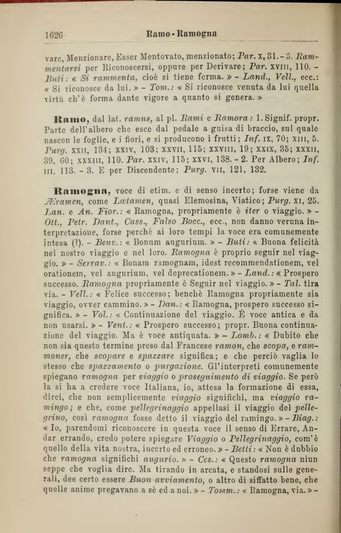 Ramogna, voce di etim. e di senso incerto; forse viene da JEramen, come Lcetamen, quasi Elemosina, Viatico ; Purg. xi, 25. J.an. e An. Fior.: « Ramogna, propriamente è iter o viaggio. » -Ott., Petr. Dant., Cass., Falso Foce., ecc., non danno veruna interpretazione, forse perchè ai loro tempi la voce era comunemente intesa (?). - Benv.: « Bonum augurium. » - Buti: « Buona felicità nel nostro viaggio e nel loro. Bamogna è proprio seguir nel viaggio. » - Serrar.: « Bonam ramognam, idest recommendationem, vel orationem, vel augurium, vel deprecationem. » - Land. : « Prospero successo. Ramogna propriamente è Seguir nel viaggio.» - Tal. tira via. - Veli.: « Felice successo; benché Ramogna propriamente sia viaggio, ovver cammino. » - Dan.: « Ramogna, prospero successo significa. » - Voi. : « Continuazione del viaggio. E voce antica e da non usarsi. » - Vent. : « Prospero successo; propr. Buona continuazione del viaggio. Ma è voce antiquata. » - Lomb.: « Dubito che non sia questo termine preso dal Francese ramon, che scopa, e ram-moner, che scopare e spazzare significa; e che perciò vaglia lo stesso che spazzamento o purgazione. Gl'interpreti comunemente spiegano ramogna per viaggio o proseguimento di viaggio. Se però la si ha a credere voce Italiana, io, attesa la formazione di essa, direi, che non semplicemente viaggio significhi, ma viaggio ramingo; e che, come pellegrinaggio appellasi il viaggio del pellegrino, così ramogna fosse detto il viaggio del ramingo. »- Biag. : « Io, parendomi riconoscere in questa voce il senso di Errare, Andar errando, credo potere spiegare Viaggio o Pellegrinaggio, com'è quello della vita nostra, incerto ed erroneo. »- Betti: « Non è dubbio che ramogna significhi augurio. » - Ces.: « Questo ramogna niun seppe che voglia dire. Ma tirando in arcata, e standosi sulle generali, dee certo essere Buon avviamento, o altro di siffatto bene, che quelle anime pregavano a sé ed a noi. » - Tomm.: « Ramogna, via.»-