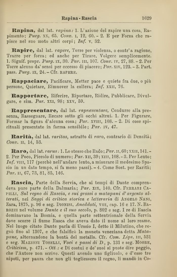 Rascia, Parte della Servia, che ai tempi di Dante comprendeva pure parte della Dalmazia; Par. xix, 140. Cfr. Ferrari Ca-pilli, Sul regno di Rascia, e sui grossi o matapani d'argento alterati, nei Saggi di critica storica e letteraria di Angelo Nani, Zara, 1875, p. 96 e seg. Dionisi, Aneddoti, vili, cap. 16 e 17. N.Ba-rozzi nel volume Dante e il suo secolo, p. 802 e seg. I re di Rascia dominavano la Bosnia, e quella parte settentrionale della Servia dove scorre il fiume Rasca che aveva dato il nome al loro reame. Nel luogo citato Dante parla di Urosio I, detto il Milutino, che regnò fino al 1307, e che falsificò la moneta veneziana detta Mata-pane, alternandone la bontà del metallo. Cfr. Com. Lips. ni, 531 e seg. Mazzoni Toselli, Voci e passi di D, p. 131 e seg. Moore, Criticism, p. 471.- Ott. : « Di costui e de'suoi si puote dire peggio, che l'Autore non scrive. Questi avendo uno figliuolo, e d'esso tre nipoti, per paura che non gli togliessero il regno, li mandò in Co-