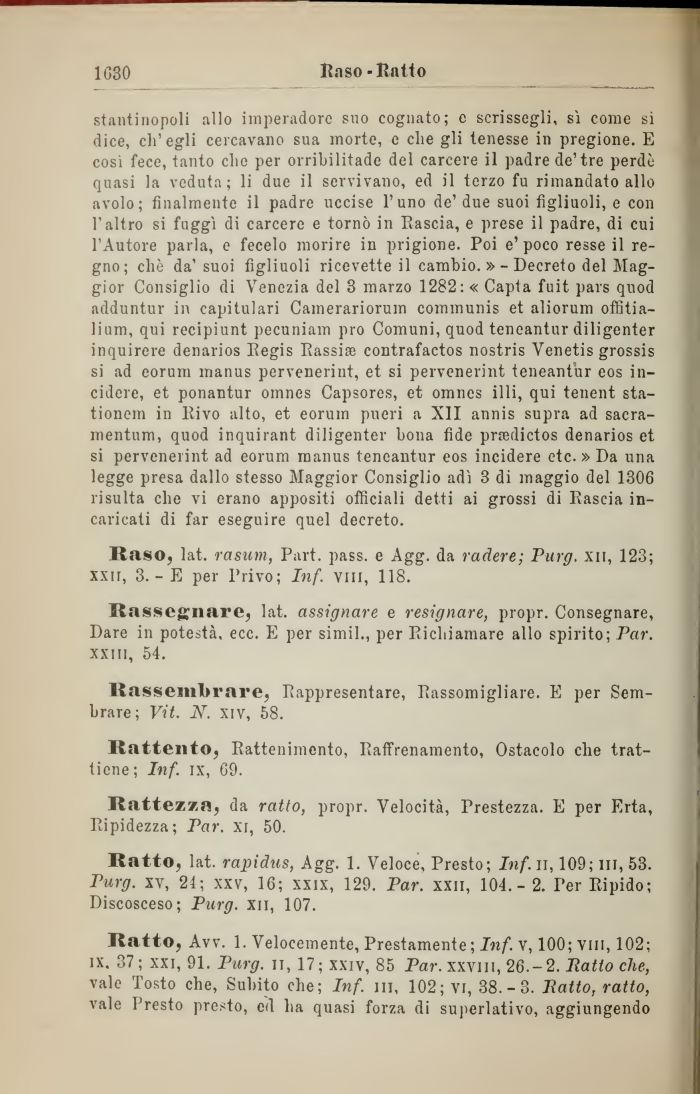 Ratto, lat. rapidus, Agg. 1. Veloce, Presto; Inf. n, 109; ni, 53. Purg. xv, 21; xxv, 16; xxix, 129. Par. xxii, 104.- 2. Ter Ripido; Discosceso; Purg. xii, 107.