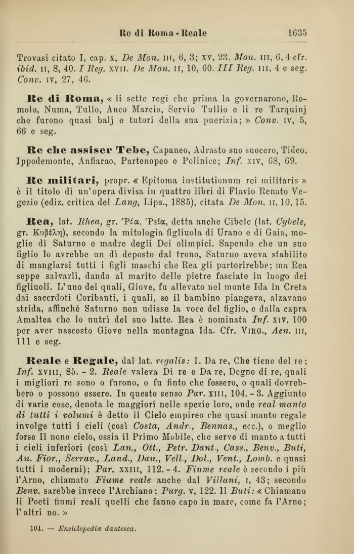 Reale e Regale, dal lat. regalis: 1. Da re, Che tiene del re; Inf. xvm, 85. - 2. Beale valeva Di re e Da re, Degno di re, quali i migliori re sono o furono, o fu finto che fossero, o quali dovrebbero o possono essere. In questo senso Par. xiii, 104.-3. Aggiunto di varie cose, denota le maggiori nelle spezie loro, onde real manto di tutti i volumi è detto il Cielo empireo che quasi manto regale involge tutti i cieli (così Costa, Andr., Bennas., ecc.), o meglio forse II nono cielo, ossia il Primo Mobile, che serve di manto a tutti i cieli inferiori (così Dan., Ott., Petr. Dant., Cass., Benv., Buti, An. Fior., Serrav., Land., Dan., Veli., Dol., Vent., Lomb. e quasi tutti i moderni); Par. xxiii, 112.-4. Fiume reale è secondo i più l'Arno, chiamato Fiume reale anche dal Villani, i, 43; secondo Benv. sarebbe invece l'Archiano ; Purg. v, 122. 11 Buti: « Chiamano li Poeti fiumi reali quelli che fanno capo in mare, come fa l'Arno; 1' altri no. »