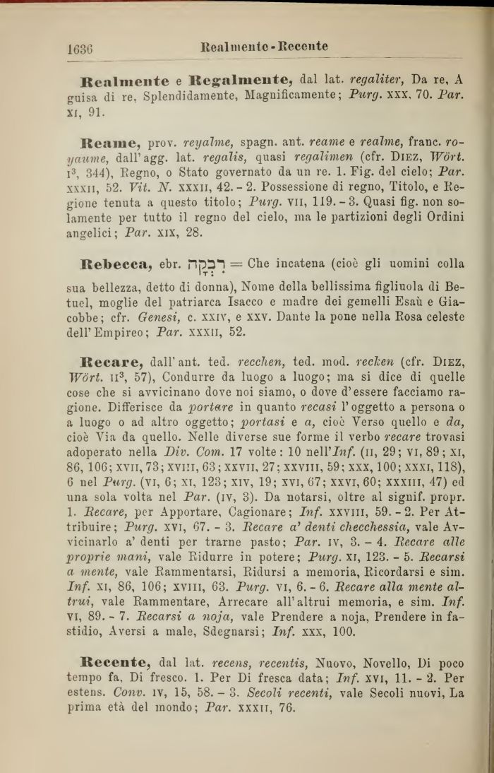 Recare, dall' ant. ted. recchen, ted. mod. reclcen (cfr. Diez, Wòrt. li3, 57), Condurre da luogo a luogo; ma si dice di quelle cose che si avvicinano dove noi siamo, o dove d'essere facciamo ragione. Differisce da portare in quanto recasi l'oggetto a persona o a luogo o ad altro oggetto; portasi e a, cioè Verso quello e da, cioè Via da quello. Nelle diverse sue forme il verbo recare trovasi adoperato nella Div. Com. 17 volte: 10 nell' Inf. (il, 29; vi, 89; xi, 86, 106; xvii, 73; xvm, 63; xxvn, 27; xxvin, 59; xxx, 100; xxxi, 118), 6 nel Purg. (vi, 6; XI, 123; xiv, 19; xvi, 67; xxvi, 60; xxxiii, 47) ed una sola volta nel Par. (iv, 3). Da notarsi, oltre al signif. propr. 1. Recare, per Apportare, Cagionare; Inf. xxvin, 59.-2. Per Attribuire; Purg. xvi, 67. - 3. Recare a' denti checchessia, vale Avvicinarlo a' denti per trarne pasto; Par. iv, 3. - 4. Recare alle proprie mani, vale Ridurre in potere; Purg. xi, 123. - 5. Recarsi a mente, vale Rammentarsi, Ridursi a memoria, Ricordarsi e sim. Inf. xi, 86, 106; xvm, 63. Purg. vi, 6.-6. Recare alla mente altrui, vale Rammentare, Arrecare all'altrui memoria, e sim. Inf. vi, 89. - 7. Recarsi a noja, vale Prendere a noja, Prendere in fastidio, Aversi a male, Sdegnarsi; Inf. xxx, 100.