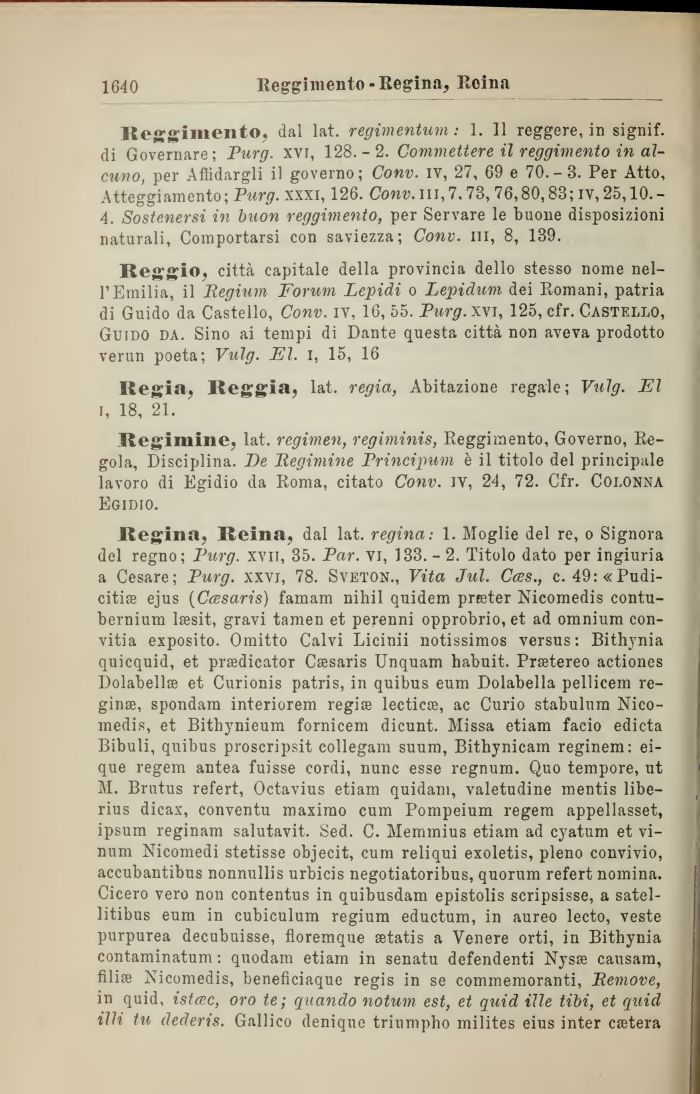 Regina, Reina, dal lat. regina: 1. Moglie del re, o Signora del regno; Purg. xvn, 35. Par. vi, 133. - 2. Titolo dato per ingiuria a Cesare; Purg. xxvj, 78. Sveton., Vita Jul. Cces., c. 49:«Pudi-citise ejus (Ccesaris) famam nibil quidem prteter Nicomedis contu-bernium lsesit, gravi tamen et perenni opprobrio, et ad omnium con-vitia exposito. Omitto Calvi Licinii notissimos versus: Bithynia quicquid, et prsedicator Csesaris Unquam habuit. Prsetereo actiones Dolabellffi et Curionis patris, in quibus eum Dolabella pellicem regina, spondam interiorem regia lecticse, ac Curio stabulum Nicomedis, et Bithynieum fornicem dicunt. Missa etiam facio edicta Bibuli, quibus proscripsit collegam suum, Bithynicam reginem: ei-que regem antea fuisse cordi, nunc esse regnum. Quo tempore, ut M. Brutus refert, Octavius etiam quidam, valetudine mentis libe-rius dicax, conventu maximo cum Pompeium regem appellasset, ipsum reginam salutavit. Sed. C. Memmius etiam ad cyatum et vimini Nicomedi stetisse objecit, cum reliqui exoletis, pieno convivio, accubantibus nonnullis urbicis negotiatoribus, quorum refert nomina. Cicero vero non contentus in quibusdam epistolis scripsisse, a satel-litibus eum in cubiculum regium eductum, in aureo lecto, veste purpurea decubuisse, floremque setatis a Venere orti, in Bithynia contaminatum : quodam etiam in senatu defendenti Nysse causam, filiffl Nicomedis, beneficiaque regis in se commemoranti, Remove, in quid, istcec, oro te; quando notum est, et quid ille tibi, et quid illi tu dederis. Gallico denique triumpho milites eius inter estera
