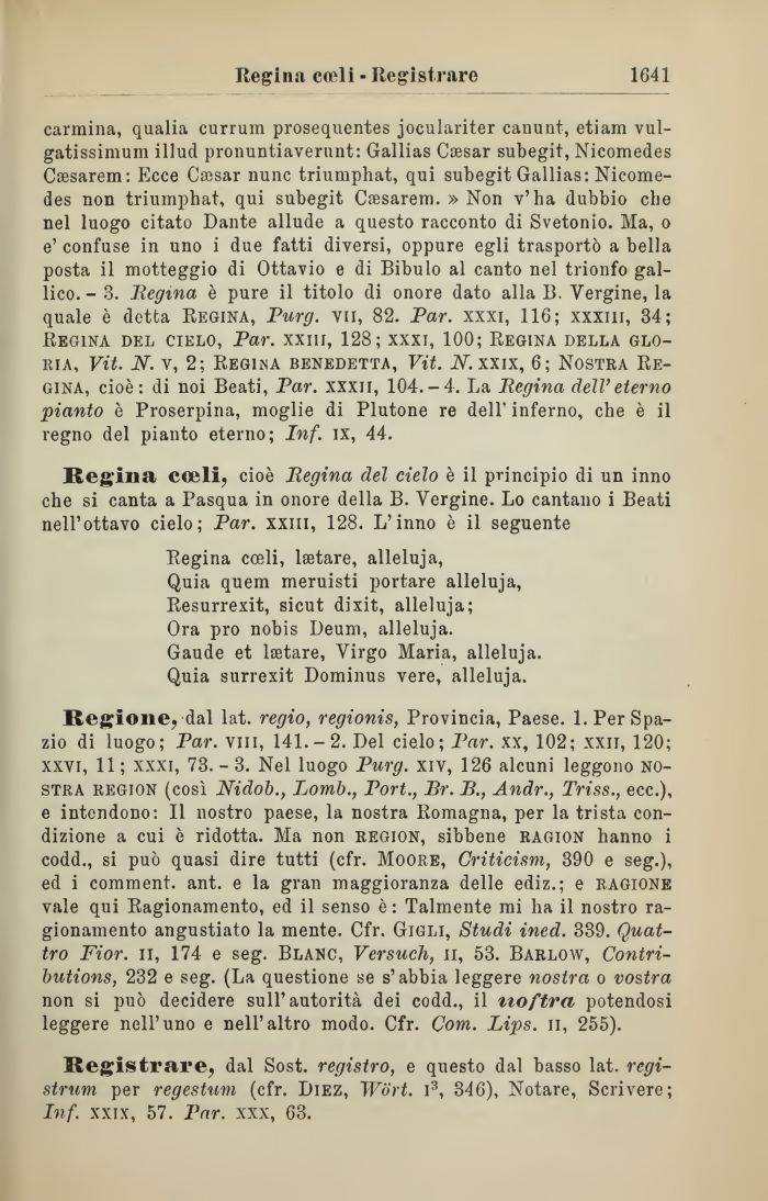 Regione, dal lat. regio, regionis, Provincia, Paese. 1. Per Spazio di luogo; Par. vili, 141.-2. Del cielo; Par. xx, 102; xxii, 120; xxvi, 11 ; xxxi, 73. - 3. Nel luogo Purg. xiv, 126 alcuni leggono nostra region (così Nidob., Lomb., Port., Br. B., Andr., Triss., ecc.), e intendono: Il nostro paese, la nostra Romagna, per la trista condizione a cui è ridotta. Ma non region, sibbene ragion hanno i codd., si può quasi dire tutti (cfr. Moore, Criticismi, 390 e seg.), ed i comment. ant. e la gran maggioranza delle ediz.; e ragione vale qui Ragionamento, ed il senso è: Talmente mi ha il nostro ragionamento angustiato la mente. Cfr. Gigli, Studi ined. 339. Quattro Fior, il, 174 e seg. Blanc, Versuch, n, 53. Barlow, Contri-butions, 232 e seg. (La questione se s'abbia leggere nostra o vostra non si può decidere sull'autorità dei codd., il noftra potendosi leggere nell'uno e nell'altro modo. Cfr. Com. Lips. n, 255).