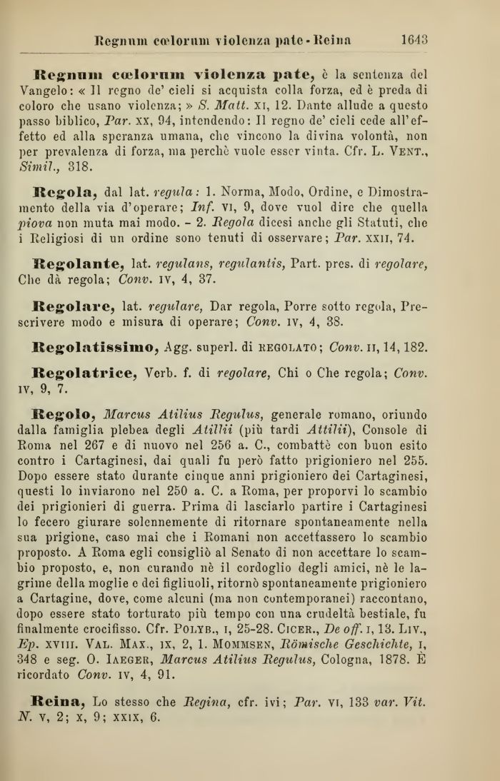 Regolo, Marcus Atilius Eegulus, generale romano, oriundo dalla famiglia plebea degli Atillii (più tardi Attilii), Console di Roma nel 267 e di nuovo nel 256 a. C., combattè con buon esito contro i Cartaginesi, dai quali fu però fatto prigioniero nel 255. Dopo essere stato durante cinque anni prigioniero dei Cartaginesi, questi lo inviarono nel 250 a. C. a Roma, per proporvi lo scambio dei prigionieri di guerra. Prima di lasciarlo partire i Cartaginesi lo fecero giurare solennemente di ritornare spontaneamente nella sua prigione, caso mai che i Romani non accettassero lo scambio proposto. A Roma egli consigliò al Senato di non accettare lo scambio proposto, e, non curando nè il cordoglio degli amici, nè le lagrime della moglie e dei figliuoli, ritornò spontaneamente prigioniero a Cartagine, dove, come alcuni (ma non contemporanei) raccontano, dopo essere stato torturato più tempo con una crudeltà bestiale, fu finalmente crocifisso. Cfr. Polyb., i, 25-28. Cicer., De off. i, 13. Liv., Ep. xvtii. Val. Max., ìx, 2, 1. Mommsen, Eómische Gescliiclite, i, 348 e seg. 0. Iaeger, Marcus Atilius Eegulus, Cologna, 1878. È ricordato Conv. iv, 4, 91.