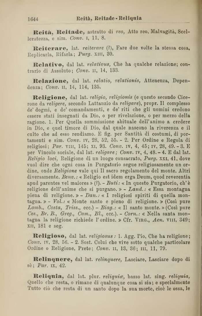 Religione, dal lat. religio, religionis (e questo secondo Cicerone da religere, secondo Lattanzio da religare), propr. Il complesso de' dogmi, e de' comandamenti, e de' riti che gli uomini credono essere stati insegnati da Dio, o per rivelazione, o per mezzo della ragione. 1. Per Quella sommissione abituale dell'animo a credere in Dio, e quel timore di Dio, dal quale nascono la riverenza e il culto che ad esso rendiamo. E fig. per Santità di costumi, di portamenti e sim. Conv. iv, 28, 52, 55. - 2. Per Ordine e Regola di religiosi; Par. vili, 145; si, 93. Conv. IV, 4, 45; iv, 28, 49.-3. E per Vincolo sociale, dal lat. religare; Conv. iv, 4, 48.-4. E dal lat. Religio loci, Religione di un luogo consacrato, Purg. xxi, 41, dove vuol dire che ogni cosa in Purgatorio segue religiosamente un ordine, onde Religione vale qui II sacro regolamento del monte. Altri diversamente. Benv.: « Religio est idem erga Deum, quod reverentia apud parentes vel maiores » (?). - Buti: « In questo Purgatorio, eh' è religione dell'anime che si purgano. » - Land.: « Essa montagna piena di religione. »- Dan.: « I religiosi spiriti di quella montagna. » - Voi.: « Monte santo e pieno di religione. » (Così pure Lomb., Costa, Triss., ecc.) - Biag.: « Il santo monte. » (Così pure Ces., Br. B., Greg., Cam., Bl., ecc.). - Com.: « Nella santa montagna la religione richiede l'ordine. » Cfr. Virg., Aen. vili, 349; xii, 181 e seg.