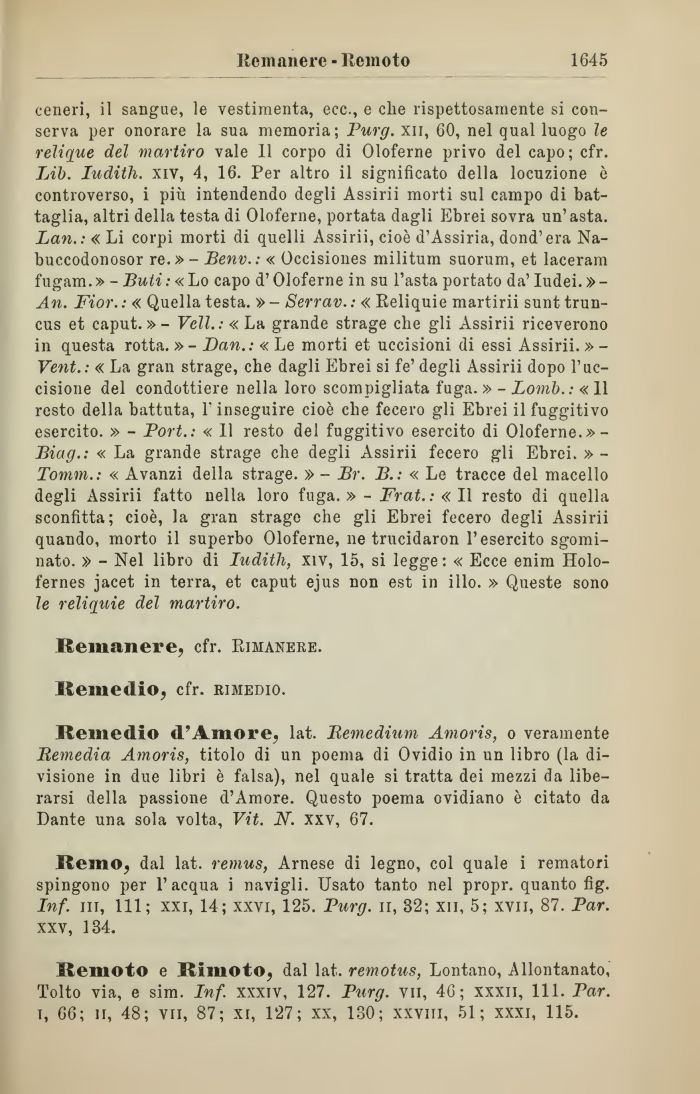 ceneri, il sangue, le vestimenta, ecc., e clie rispettosamente si conserva per onorare la sua memoria; Purg. xii, 60, nel qual luogo le relique del martiro vale 11 corpo di Oloferne privo del capo; cfr. Lib. Iudith. xiv, 4, 16. Per altro il significato della locuzione è controverso, i più intendendo degli Assirii morti sul campo di battaglia, altri della testa di Oloferne, portata dagli Ebrei sovra un'asta. Lan.: « Li corpi morti di quelli Assirii, cioè d'Assiria, dond'era Nabucodònosor re. » - Benv. : « Occisiones militum suorum, et laceram fugam.» - Buti: « Lo capo d'Oloferne in su l'asta portato da' Iudei. »-An. Fior. : « Quella testa. » - Serrav. : « Reliquie martirii sunt trun-cus et caput.» - Veli. .-«La grande strage che gli Assirii riceverono in questa rotta. »- Dan.: « Le morti et uccisioni di essi Assirii. » -Vent.: « La gran strage, che dagli Ebrei si fe' degli Assirii dopo l'uccisione del condottiere nella loro scompigliata fuga. » - Lomb.: « 11 resto della battuta, l'inseguire cioè che fecero gli Ebrei il fuggitivo esercito. » - Port.: « 11 resto del fuggitivo esercito di Oloferne.»-Biag.: « La grande strage che degli Assirii fecero gli Ebrei. » -Tomm.: « Avanzi della strage. » - Br. B.: « Le tracce del macello degli Assirii fatto nella loro fuga. » - Frat. : « Il resto di quella sconfitta; cioè, la gran strago che gli Ebrei fecero degli Assirii quando, morto il superbo Oloferne, ne trucidaron l'esercito sgominato. » - Nel libro di Iudith, xiv, 15, si legge : « Ecce enim Holo-fernes jacet in terra, et caput ejus non est in ilio. » Queste sono le reliquie del martiro.