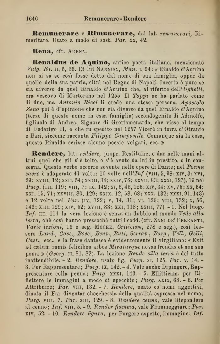 Rendere, lat. recidere, propr. Restituire, e dar nelle mani altrui quel che gli s'è tolto, o s'è avuto da lui in prestito, o in consegna. Questo verbo occorre sovente nelle opere di Dante; nel Poema sacro è adoperato 41 volta: 10 volte nell'In/, (vili, 5, 98; xiv, 3; xvi, 29; xviii, 12; xxn, 54; xxm, 34; xxiv, 76; xxvii, 83; xxxi, 127), 19 nel Purg. (ili, 119; vili, 7; ix, 142; xi, 6,46,125; xiv, 34; xv, 75; xx, 54; xxi, 15, 71; xxviii, 80, 129; xxix, 12, 58, 68; xxx, 132; xxxi, 91,143) e 12 volte nel Par. (iv, 122; v, 14, 31; vi, 126; vili, 132; x, 56, 146; xiii, 129; xiv, 52; xvui, 83; xxi, 118; xxm, 77). - 1. Nel luogo Inf. in, 114 la vera lezione è senza un dubbio al mondo Vede alla terra, che così hanno pressoché tutti i codd. (cfr. Zani de'Ferranti, Varie lezioni, 16 e seg. Moore, Criticism, 278 e seg.), così lessero Land., Cass., Bocc., Benv., Buti, Serrav., Barg., Veli., Gelli, Cast., ecc., e la frase dantesca è evidentemente il virgiliano :« Exit ad caìlum ramis felicibus arbos Miraturque novas frondas et non sua poma » (Georg, il, 81, 82). La lezione Bende alla terra è del tutto inattendibile. - 2. Pendere, usato fig. Purg. xi, 125. Par. v, 14. -3. Per Rappresentare ; Purg. ix, 142. - 4. Yale anche Dipingere, Rappresentare colla penna; Purg. xxxi, 143. - 5. Ellitticam. per Riflettere le immagini a modo di specchio; Purg. xxix, 68. - 6. Per Attribuire; Par. Vili, 132.-7. Pendere, usato co'nomi aggettivi, dinota il Far diventar checchessia della qualità espressa nel nome; Purg. vili, 7. Par. xm, 129. - 8. Rendere cenno, vale Rispondere al cenno; Inf. vili, 5. - 9. Render fiamma, vale Fiammeggiare; Par. xiv, 52. - 10. Rendere figura, per Porgere aspetto, immagine; Inf.