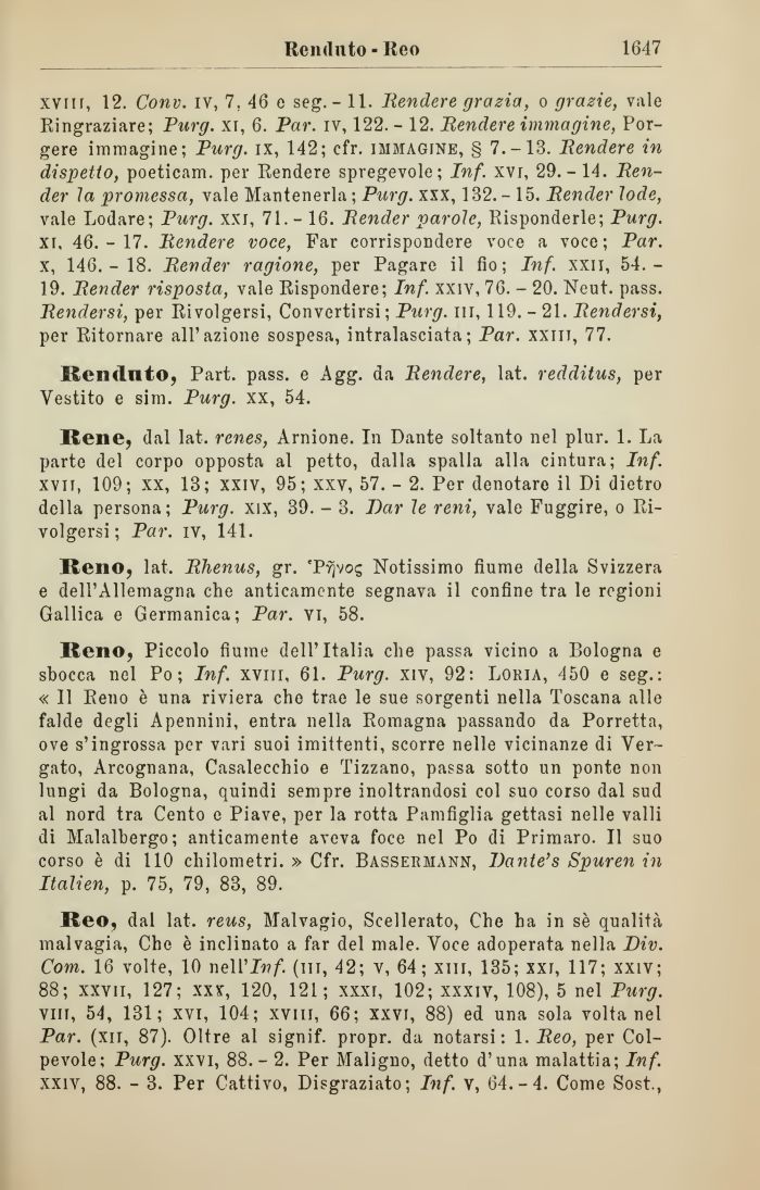 Reno, Piccolo fiume dell'Italia che passa vicino a Bologna e sbocca nel Po; Inf. xviii, 61. Purg. xiv, 92: Loria, 450 e seg.: « Il Reno è una riviera che trae le sue sorgenti nella Toscana alle falde degli Apennini, entra nella Romagna passando da Porretta, ove s'ingrossa per vari suoi imittenti, scorre nelle vicinanze di Vergato, Arcognana, Casalecchio e lizzano, passa sotto un ponte non lungi da Bologna, quindi sempre inoltrandosi col suo corso dal sud al nord tra Cento e Piave, per la rotta Pamfiglia gettasi nelle valli di Malalbergo; anticamente aveva foce nel Po di Primaro. Il suo corso è di 110 chilometri. » Cfr. Bassermann, Dante's Spuren in Italien, p. 75, 79, 83, 89.