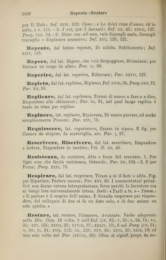 Restare, lat. restare, Piimanere, Avanzare. Verbo adoperato nella Div. Com. 18 volte, 9 nell'In/. (ìv, 82; v, 31 ; x, 24, 74; xx, 35; xxv, 135; xxvii, 33; xxviii, 67; xxxiv, 19), 8 nel Purg. (in, 91; v, 34; xi, 24; xvii, 112; xx, 139; xxv, 85; xxvi, 33; xxix, 19) ed una sola volta nel Par. (xxviii, 88). Oltre al signif. propr. da no-