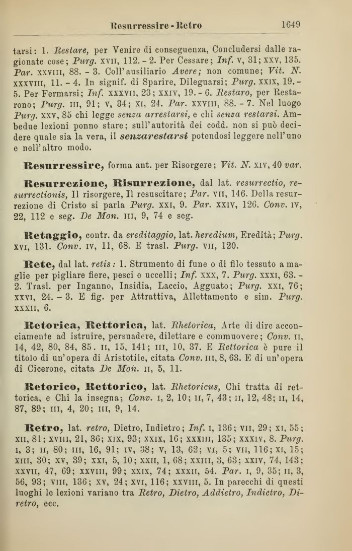 tarsi: 1. Restare, per Venire di conseguenza, Concludersi dalle ragionate cose ; Purg. xvn, 112. - 2. Per Cessare ; Inf. v, 31; xxv, 135. Par. xxvili, 88. - 3. Coli'ausiliario Avere; non comune; Vit. N. xxxviii, 11. - 4. In signif. di Sparire, Dileguarsi; Purg. xxix, 19.-5. Per Fermarsi; Inf. xxxvii, 23; xxiv, 19.-6. Restaro, per Restarono; Purg. in, 91; V, 34; xi, 24. Par. xxvm, 88.-7. Nel luogo Purg. xxv, 85 chi legge senza arrestarsi, e chi senza restarsi. Ambedue lezioni ponno stare; sull'autorità dei codd. non si può decidere quale sia la vera, il senzarestarsi potendosi leggere nell'uno e nell'altro modo.