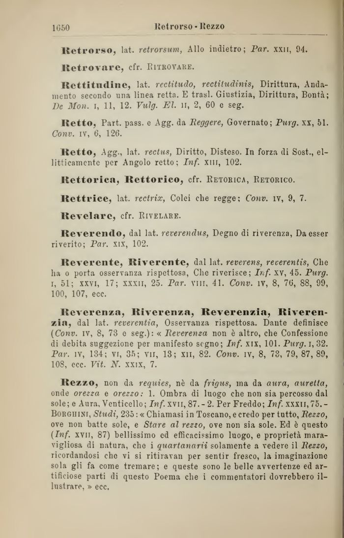 Rezzo, non da requies, nč da frigus, ma da aura, auretta, onde orezza e orezzo: 1. Ombra di luogo che non sia percosso dal sole; e Aura, Venticello; Inf. xvn, 87. - 2. Per Freddo; Inf. xxxn,75.-Borghini, Studi, 235 : « Chiamasi in Toscano, e credo per tutto, Rezzo, ove non batte sole, e Stare al rezzo, ove non sia sole. Ed č questo (Inf. xvn, 87) bellissimo ed efficacissimo luogo, e proprietą mara-vigliosa di natura, che i quartanarii solamente a vedere il Rezzo, ricordandosi che vi si ritiravan per sentir fresco, la imaginazione sola gli fa come tremare; e queste sono le belle avvertenze ed artificiose parti di questo Poema che i commentatori dovrebbero illustrare, » ecc.