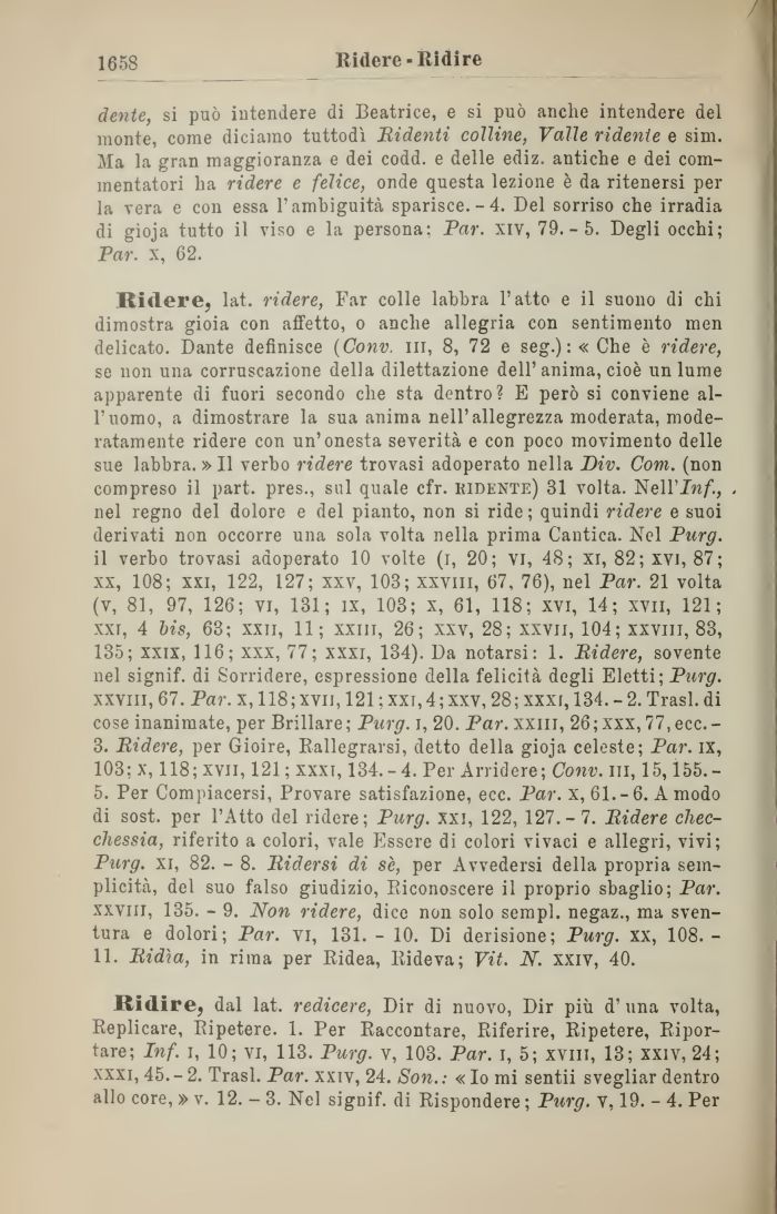 xxi, 4 bis, 63; xxu, 11; xxiii, 26; xxv, 28; xxvii, 104; xxvm, 83, 135; xxix, 116; xxx, 77; xxxi, 134). Da notarsi: 1. Ridere, sovente nel signif. di Sorridere, espressione della felicità degli Eletti; Purg. xxviii, 67. Par. x, 118 ; xvii, 121 ; xxi, 4 ; xxv, 28; xxxi, 134. - 2. Trasl. di cose inanimate, per Brillare; Purg. i, 20. Par. xxiii, 26;xxx, 77,ecc.-3. Ridere, per Gioire, Rallegrarsi, detto della gioja celeste; Par. ix, 103; x, 118; xvii, 121; xxxi, 134.-4. Per Arridere; Conv. in, 15,155.-5. Per Compiacersi, Provare satisfazione, ecc. Par. x, 61.-6. A modo di sost. per l'Atto del ridere; Purg. xxi, 122, 127.- 7. Ridere checchessia, riferito a colori, vale Essere di colori vivaci e allegri, vivi; Purg. xi, 82. - 8. Ridersi di sè, per Avvedersi della propria semplicità, del suo falso giudizio, Riconoscere il proprio sbaglio; Par. xxviii, 135. - 9. Non ridere, dice non solo sempl. negaz., ma sventura e dolori; Par. vi, 131. - 10. Di derisione; Purg. xx, 108. -11. Ridia, in rima per Ridea, Rideva; Vit. N. xxiv, 40.