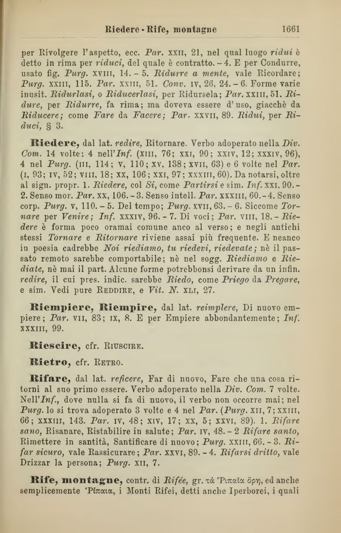 Riedere, dal lat. redire, Ritornare. Verbo adoperato nella Div. Com. 14 volte: 4 neWInf. (xiii, 76; xxi, 90; xxiv, 12; xxxiv, 96), 4 nel Purg. (ni, 114; v, 110; xv, 188; xvn, 63) e 6 volte nel Par. (i, 93; iv, 52; vili, 18; xx, 106;xxi, 97; xxxiii, 60). Da notarsi, oltre al sign. propr. 1. Riedere, col Si, come Partirsi e sim. Inf. xxi, 90.-2. Senso mor. Par. xx, 106.-3. Senso intell. Par. xxxiii, 60.-4. Senso corp. Purg. v, 110.-5. Del tempo; Purg. xvu, 63. - 6. Siccome Tornare per Venire; Inf. xxxiv, 96.-7. Di voci; Par. vili, 18. - Riedere è forma poco oramai comune anco al verso; e negli antichi stessi Tornare e Ritornare riviene assai più frequente. E neanco in poesia cadrebbe Noi riediamo, tu riedevi, riedevate; nè il passato remoto sarebbe comportabile; nè nel sogg. Riediamo e Rie-diate, nè mai il part. Alcune forme potrebbonsi derivare da un infin. redire, il cui pres. indie, sarebbe Riedo, come Priego da Pregare, e sim. Vedi pure Reddire, e Vit. N. xli, 27.