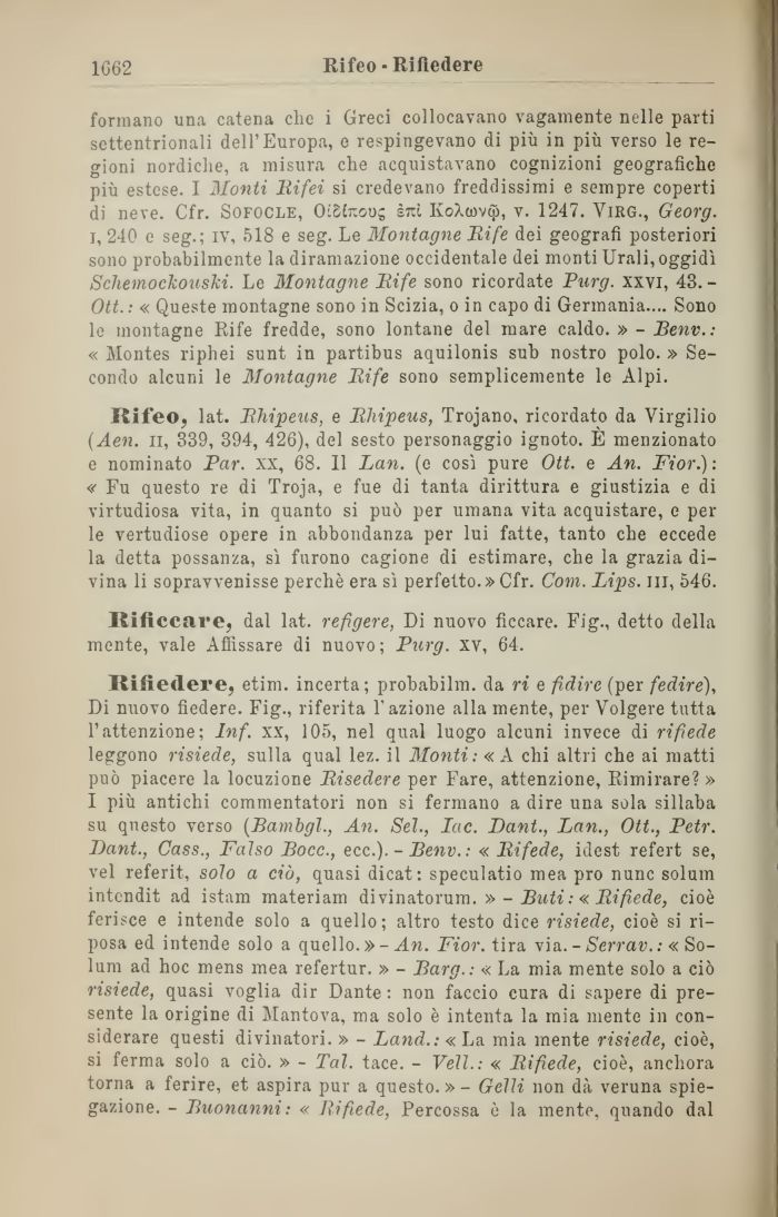 Rifìedere, etim. incerta; probabilm. da ri e fidire (per fedire), Di nuovo Sedere. Fig., riferita l'azione alla mente, per Volgere tutta l'attenzione; Inf. xx, 105, nel qual luogo alcuni invece di rifìede leggono risiede, sulla qual lez. il Monti : « A chi altri che ai matti può piacere la locuzione Risedere per Fare, attenzione, Rimirare?» I più antichi commentatori non si fermano a dire una sola sillaba su questo verso (Bambgl., An. Sei., Iac. Dant., Lan., Ott., Petr. Dant., Cass., Falso Bocc., ecc.). - Benv. : « Rifede, idest refert se, vel referit, solo a ciò, quasi dicat: speculatio mea prò nunc solum intcndit ad istam materiam divinatorum. » - Buti : « Rifìede, cioè ferisce e intende solo a quello; altro testo dice risiede, cioè si riposa ed intende solo a quello. »- An. Fior, tira via. - Serrav. : « Solum ad hoc mens mea refertur. » - Barg.: « La mia mente solo a ciò risiede, quasi voglia dir Dante : non faccio cura di sapere di presente la origine di Mantova, ma solo è intenta la mia niente in considerare questi divinatori. » - Land.: «La mia mente risiede, cioè, si ferma solo a ciò. » - Tal. tace. - Veli.: « Rifìede, cioè, anchora torna a ferire, et aspira pur a questo. » - Gelli non dà veruna spiegazione. - Buonanni: « Rifìede, Percossa è la mente, quando dal