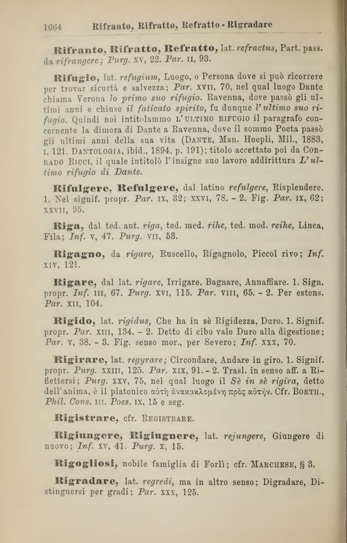 Rifngio, lat, refugium, Luogo, o Persona dove si può ricorrere per trovar sicurtà e salvezza; Par. xvn, 70, nel qual luogo Dante chiama Verona lo primo suo rifugio. Ravenna, dove passò gli ultimi anni e chiuse il faticato spirito, fu dunque l'ultimo suo rifugio. Quindi noi intitolammo l'ultimo rifugio il paragrafo concernente la dimora di Dante a Ravenna, dove il sommo Poeta passò gli ultimi anni della sua vita (Dante, Man. Hoepli, Mil., 1883, i, 121. Dantologia, ibid., 1894, p. 191); titolo accettato poi da Corrado Ricci, il quale intitolò l'insigne suo lavoro addirittura L'ultimo rifugio di Dante.