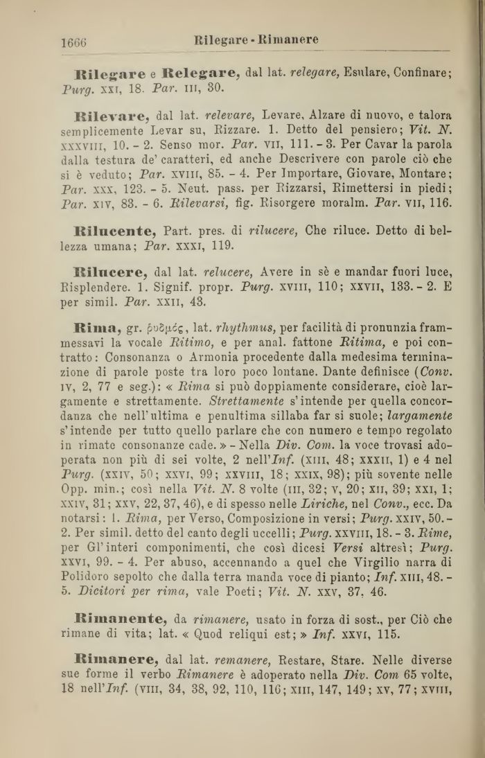 Rimanere, dal lat. remanere, Restare, Stare. Nelle diverse sue forme il verbo Rimanere è adoperato nella Div. Com 65 volte, 18 nell'In/, (vili, 34, 38, 92, 110, 116; xm, 147, 149; xv, 77; xviii,