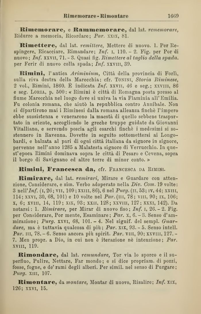 2 voi., Rimini, 1860. È indicata Inf. xxvit, 46 e seg.; xxvm, 86 e seg. Loria, p. 500: « Rimini è città di Romagna posta presso al fiume Marecchia nel luogo dove si univa la via Flaminia all'Emilia. Fu colonia romana, che aiutò la repubblica contro Annibale. Non si dipartirono mai i Riminesi dalla romana alleanza finché l'impero ebbe sussistenza e venerarono la maestà di quello sebbene trasportato in oriente, accogliendo le greche truppe guidate da Giovanni Vitalliano, e servendo poscia agli esarchi finché i medesimi si sostennero in Ravenna. Dovette in seguito sottomettersi ai Longobardi, e balzata al pari di ogni città italiana da signore in signore, pervenne nell'anno 1285 a Malatesta signore di Verrucchio. In quest'epoca Rimini dominava sopra le città di Pesaro e Cevena, sopra il borgo di Savignano ed altre terre di minor conto. »