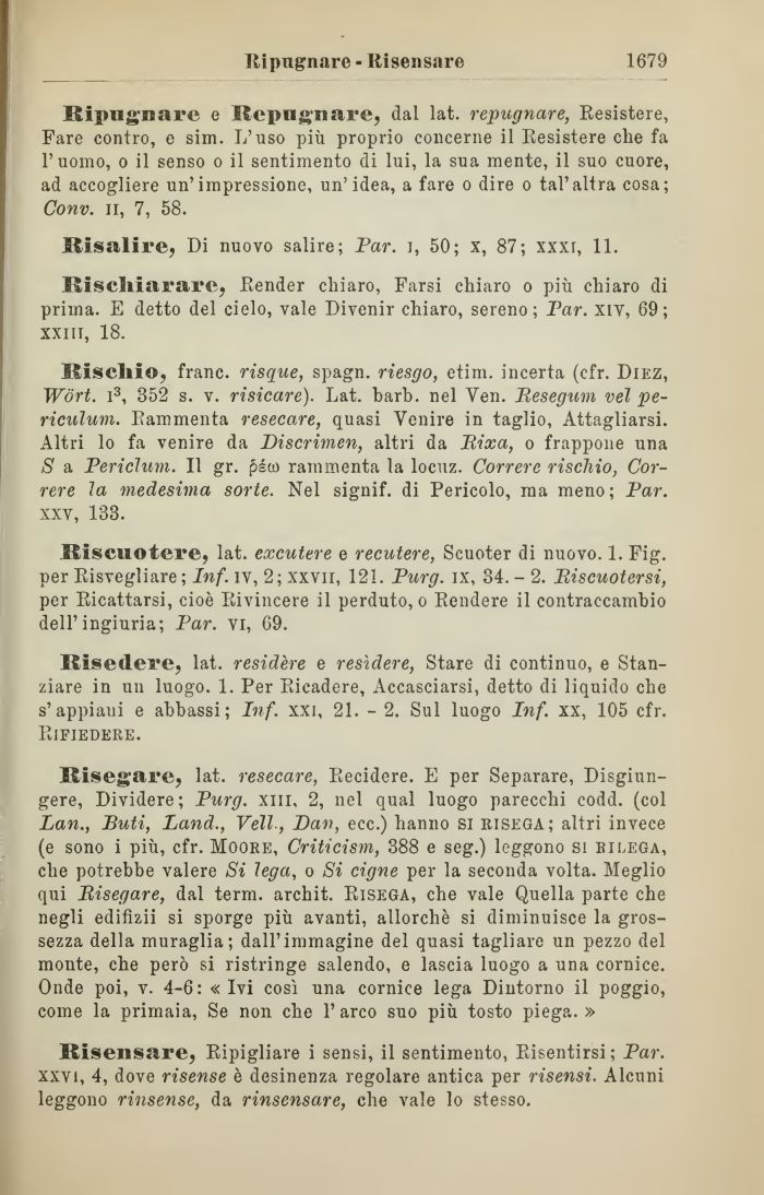 Risegare, lat. resecare, Eecidere. E per Separare, Disgiungere, Dividere; Purg. xiii, 2, nel qual luogo parecchi codd. (col Lan., Buti, Land., Veli-, Dan, ecc.) hanno sì risega ; altri invece (e sono i più, cfr. Moore, Criticism, 388 e seg.) leggono si rilega, che potrebbe valere Si lega, o Si cigne per la seconda volta. Meglio qui Bisegare, dal term. archit. Eisega, che vale Quella parte che negli edifìzii si sporge più avanti, allorché si diminuisce la grossezza della muraglia; dall'immagine del quasi tagliare un pezzo del monte, che però si ristringe salendo, e lascia luogo a una cornice. Onde poi, v. 4-6: «Ivi così una cornice lega Dintorno il poggio, come la primaia, Se non che l'arco suo più tosto piega.»