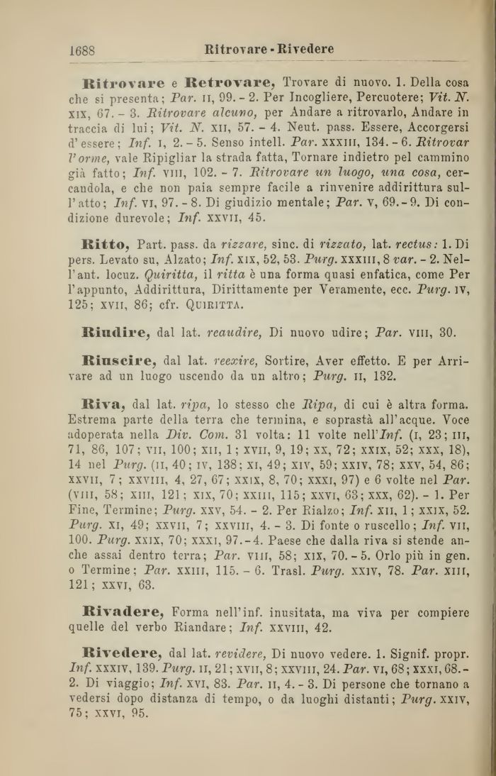 Rivedere, dal lat. revidere, Di nuovo vedere. 1. Signif. propr. Inf. xxxiv, 139. Purg. ir, 21 ; xvii, 8; XXVlll, 24. Par. vi, 68; xxxi, 68.-2. Di viaggio; Inf. xvi, 83. Par. li, 4.- 3. Di persone che tornano a vedersi dopo distanza di tempo, o da luoghi distanti; Purg.xxiv, 75; xxvi, 95.