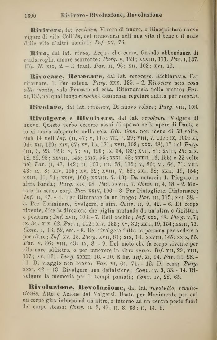 Rivolgere e Rivolvere, dal lat, revolvere, Volgere di nuovo. Questo verbo occorre assai di spesso nelle opere di Dante e lo si trova adoperato nella sola Div. Com. non meno di 53 volte, cioè 14 nell'In/, (n, 47; v, 115; vii, 7, 29; vili, 7, 117; ix, 100; xi, 94; xii, 139; xiv, 67; xv, 15, 121; xvn, 103; xxx, 48), 17 nel Purg. (in, 3, 23, 123; v, 7; vi, 120; ix, 34, 139; xvii, 81; xvm, 25; xix, 18, 62, 98; xxviii, 145; xxix, 55; xxxi, 42; xxxii, 16, 155) e 22 volte nel Par. (i, 47, 142; il, 100; in, 28, 115; v, 86; vi, 64, 71; vili, 43; ìx, 8; xiv, 135; xv, 32; xvm, 7, 52; xxi, 38; xxn, 19, 154; xxiii, 11, 71; xxiv, 106; xxviii, 7, 13). Da notarsi: 1. Piegare in altra banda; Purg. xix, 98. Par. xxviii, 7. Conv. il, 4, 18.-2. Mutare in senso corp. Par. xxiv, 106.-3. Per Distogliere, Distornare; Inf. n, 47. - 4. Per Ritornare in un luogo; Par. in, 115; xxi, 38.-5. Per Esaminare, Svolgere, e sim. Conv. il, 9, 42. - 6. Di corpo vivente, dice la direzione che piglia mutando da un'altra o dirittura o positura; Inf. xvn, 103.-7. Dell'occhio; Inf. xxx, 48. Purg. v, 7; ix, 34; xix, 62. Par. i, 142; Xiv, 135; xv, 32; xxn, 19,154 ; xxiii, 71. Conv. i, 13, 52, ecc.-8. Del rivolgere tutta la persona per vedere o per altro; Inf. xv, 15. Purg. xvii, 81; xix, 18; xxviii, 145; xxix, 55. Par. v, 86; vili, 43; ìx, 8. - 9. Del moto che fa corpo vivente per ritornare addietro, o per muovere in altro verso; Inf. vii, 29; vili, 117; xv, 121. Purg. xxxn, 16.-10. E fig. Inf. xi, 94. Par. ili, 28.-11. Di viaggio non breve; Par. vi, 64, 71.- 12. Di cosa; Purg. xxxi, 42. - 13. Rivolgere una definizione; Conv. iv, 3, 35. - 14. Rivolgere la memoria per li tempi passati; Conv. iv, 28, 65.