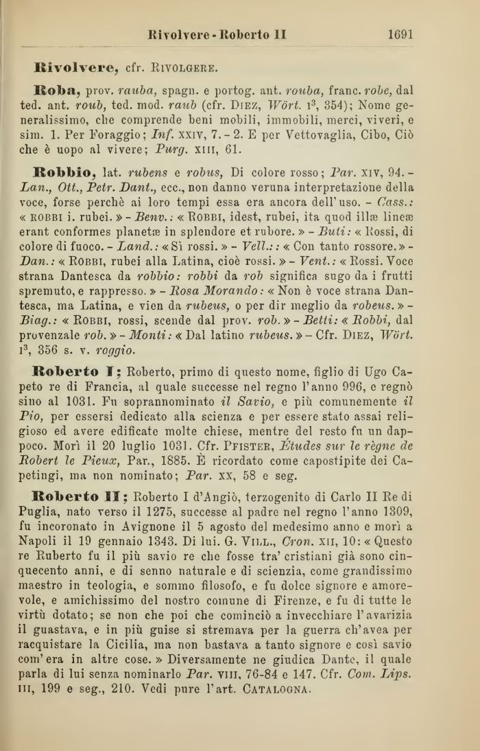 Robbio, lat. rubens e robus, Di colore rosso; Par. xiv, 94.-Lan., Ott., Petr. JDant., ecc., non danno veruna interpretazione della voce, forse perchè ai loro tempi essa era ancora dell'uso. - Cass.: « robbi i. rubei. » - Benv. : « Bobbi, idest, rubei, ita quod ili® linese erant conformes pianeta in splendore et rubore. » - Buti: « Rossi, di colore di fuoco. - Land. : « Sì rossi. » - Veli.: : « Con tanto rossore. » -Dan.: « Robbi, rubei alla Latina, cioè rossi. » - Veni.: « Rossi. Voce strana Dantesca da robbio: robbi da rob significa sugo da i frutti spremuto, e rappresso. » - Uosa Morando : « Non è voce strana Dantesca, ma Latina, e vien da rubeus, o per dir meglio da robeus.»-Biag.: « Robbi, rossi, scende dal prov. rob.» - Betti: « Bobbi, dal provenzale rob. » - Monti: « Dal latino rubeus. » - Cfr. Diez, Wort. i3, 356 s. v. roggio.