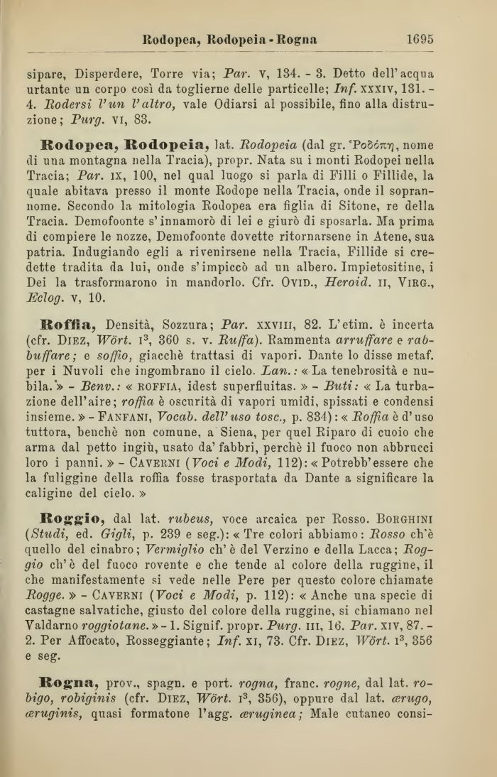 Roflia, Densità, Sozzura; Par. xxviii, 82. L'etim. è incerta (cfr. Diez, Wòrt. i3, 360 s. v. Ruffa). Rammenta arruffare e rabbuffare; e soffio, giacché trattasi di vapori. Dante lo disse metaf. per i Nuvoli che ingombrano il cielo. Lan. : «La tenebrosità e nu-bila.'» - Benv.: « roffia, idest superfiuitas. » - Buti: « La turba-zione dell'aire; roffia è oscurità di vapori umidi, spissati e condensi insieme. »-Fanfani, Vocab. dell'uso tose., p. 834) :« Roffia è d'uso tuttora, benché non comune, a Siena, per quel Riparo di cuoio che arma dal petto ingiù, usato da' fabbri, perchè il fuoco non abbrucci loro i panni. » - Caveeni ( Voci e Modi, 112): « Potrebb'essere che la fuliggine della roffia fosse trasportata da Dante a significare la caligine del cielo. »