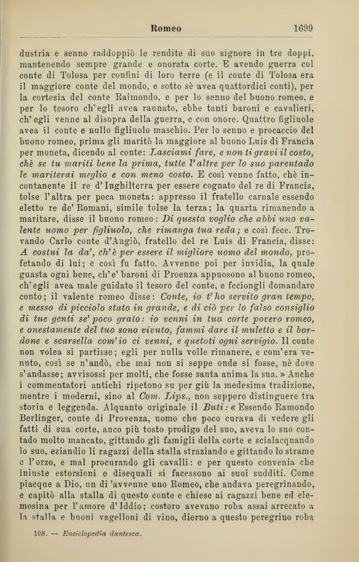dustria e senno raddoppiò le rendite di suo signore in tre doppi, mantenendo sempre grande e onorata corte. E avendo guerra col conte di Tolosa per confini di loro terre (e il conte di Tolosa era il maggiore conte del mondo, e sotto sè avea quattordici conti), per la cortesia del conte Raimondo, e per lo senno del buono romeo, e per lo tesoro ch'egli avea raunato, ebbe tanti baroni e cavalieri, ch'egli venne al disopra della guerra, e con onore. Quattro figliuole avea il conte e nullo figliuolo maschio. Per lo senno e procaccio del buono romeo, prima gli maritò la maggiore al buono Luis di Francia per moneta, dicendo al conte: Lasciami fare, e non ti gravi il costo, che se tu mariti bene la mima, tutte l'altre per lo suo parentado le mariterai meglio e con meno costo. E così venne fatto, chè incontanente il re d'Inghilterra per essere cognato del re di Francia, tolse l'altra per poca moneta: appresso il fratello carnale essendo eletto re de'Romani, simile tolse la terza; la quarta rimanendo a maritare, disse il buono romeo: Di questa voglio che abbi uno valente uomo per figliuolo, che rimanga tua reda; e così fece. Trovando Carlo conte d'Angiò, fratello del re Luis di Francia, disse: A costui la da', eh'è per essere il migliore uomo del mondo, profetando di lui; e così fu fatto. Avvenne poi per invidia, la quale guasta ogni bene, eli'e'baroni di Proenza appuosono al buono romeo, ch'egli avea male guidato il tesoro del conte, e feciongli domandare conto; il valente romeo disse: Conte, io t'ho servito gran tempo, e messo di picciolo stato in grande, e di ciò per lo falso consiglio di tue genti se' poco grato: io venni in tua corte povero romeo, e onestamente del tuo sono vivuto, fammi dare il muletto e il bordone e scarsella com' io ci venni, e quetoti ogni servigio. Il conte non volea si partisse; egli per nulla volle rimanere, e com'era venuto, così se n'andò, che mai non si seppe onde si fosse, nè dove s'andasse; avvisossi per molti, che fosse santa anima la sua. » Anche i commentatori antichi ripetono su per giù la medesima tradizione, mentre i moderni, sino al Com. Lips., non seppero distinguere tra storia e leggenda. Alquanto originale il Buti: « Essendo Ramondo Berlinger, conte di Provenza, uomo che poco curava di vedere gli fatti di sua corte, anco più tosto prodigo del suo, aveva lo suo contado molto mancato, gittando gli famigli della corte e scialacquando lo suo, eziandio li ragazzi della stalla straziando e gittando lo strame e l'orzo, e mal procurando gli cavalli: e per questo convenia che iniuste estorsioni e disequali si facessono ai suoi sudditi. Come piacque a Dio, un di 'avvenne uno Romeo, che andava peregrinando, e capitò alla stalla di questo conte e chiese ai ragazzi bene ed elemosina per l'amore d'Iddio; costoro avevano roba assai arrecato a la stalla e buoni vagelloni di vino, dierno a questo peregrino roba