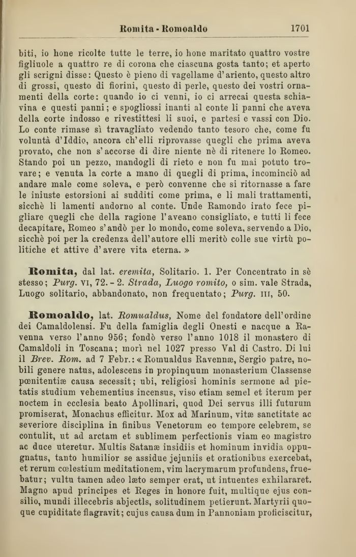 Romoaldo, lat. Bomualdus, Nome del fondatore dell'ordine dei Camaldolensi. Fu della famiglia degli Onesti e nacque a Ravenna verso l'anno 956; fondò verso l'anno 1018 il monastero di Camaldoli in Toscana; morì nel 1027 presso Val di Castro. Di lui il Brev. Bom. ad 7 Febr.: « Romualdus Ravenna, Sergio patre, nobili genere natus, adolescens in propinquum monasterium Classense poenitentia causa secessit; ubi, religiosi hominis sermone ad pie-tatis studium vehementius incensus, viso etiam semel et iterum per noctem in ecclesia beato Apollinari, quod Dei servus i 1 li futurum promiserat, Monachus efScitur. Mox ad Marinum, vita sanctitate ac severiore disciplina in finibus Venetorum eo tempore celebrem, se contulit, ut ad arctam et sublimem perfectionis viam eo magistro ac duce uteretur. Multis Satana insidiis et hominum invidia oppu-gnatus, tanto humilior se assidue jejuniis et orationibus exercebat, et rerum ccelestium meditationem, vim lacrymarum profundens, frue-batur; vultu tamen adeo lato semper erat, ut intuentes exhilararet. Magno apud principes et Reges in honore fuit, multique ejus Consilio, mundi illecebris abjectls, solitudinem petierunt. Martyrii quoque cupiditate fiagravit; cujus causa dum in Pannoniam proficiscitur,