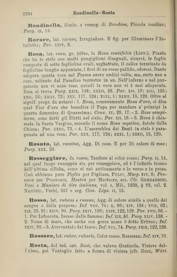 Rosso, lat. rubeus e russus, Agg. di colore simile a quello del sangue o della porpora; Inf. vili, 74; x, 86; xiv, 134; xvii, 62; xix, 33, 81 ; xxiv, 90. Purg. xxiv, 138 ; xxix, 122,128. Par. xvii, 66. -