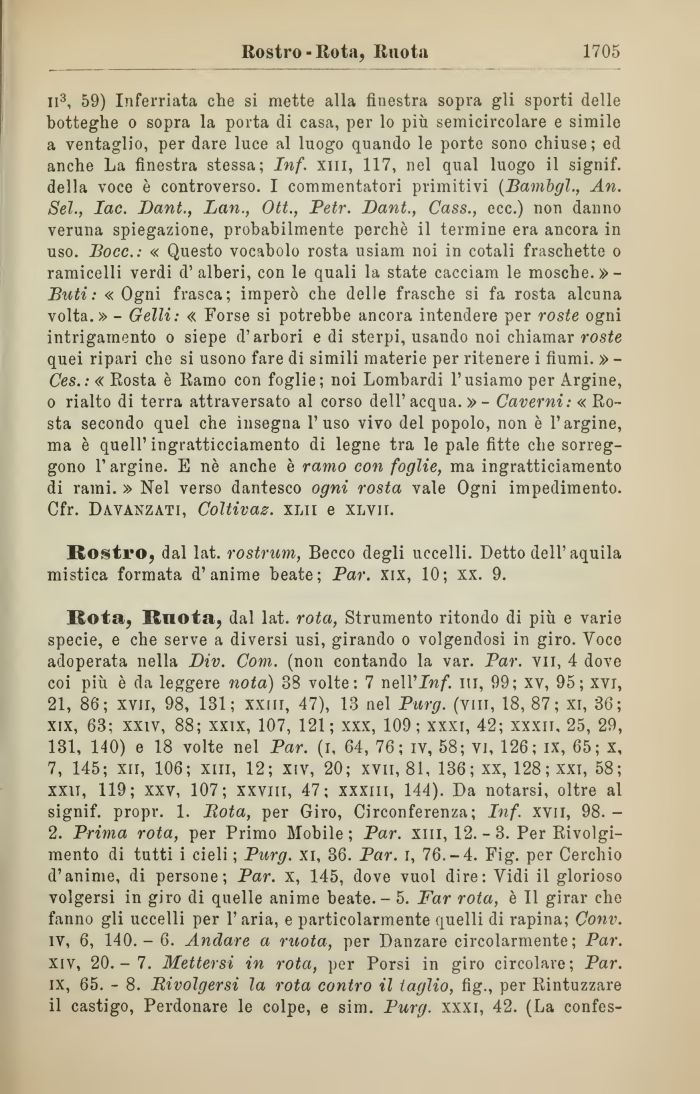 Rota, Ruota, dal lat. rota, Strumento ritondo di più e varie specie, e che serve a diversi usi, girando o volgendosi in giro. Yoce adoperata nella Div. Com. (non contando la var. Par. vii, 4 dove coi più è da leggere nota) 38 volte: 7 neWInf. iti, 99; xv, 95; xvi, 21, 86; xvii, 98, 131; xxm, 47), 13 nel Purg. (vm, 18, 87; xi, 36; xix, 63; xxiv, 88; xxix, 107, 121; xxx, 109; xxxi, 42; xxxn, 25, 29, 131, 140) e 18 volte nel Par. (i, 64, 76; iv, 58; vi, 126; ix, 65; x, 7, 145; xii, 106; xiii, 12; xiv, 20; xvii, 81, 136; xx, 128; xxi, 58; xxu, 119; xxv, 107; xxvill, 47; xxxiii, 144). Da notarsi, oltre al signif. propr. 1. Bota, per Giro, Circonferenza; Inf. xvii, 98. -2. Prima rota, per Primo Mobile ; Par. xiii, 12. - 3. Per Rivolgimento di tutti i cieli ; Purg. xi, 36. Par. i, 76.-4. Fig. per Cerchio d'anime, di persone; Par. x, 145, dove vuol dire: Vidi il glorioso volgersi in giro di quelle anime beate. - 5. Far rota, è II girar che fanno gli uccelli per 1' aria, e particolarmente quelli di rapina; Conv. iv, 6, 140.- 6. Andare a ruota, per Danzare circolarmente; Par. xiv, 20.-7. Mettersi in rota, per Porsi in giro circolare; Par. ix, 65. - 8. Rivolgersi la rota contro il taglio, fig., per Rintuzzare il castigo, Perdonare le colpe, e sim. Purg. xxxi, 42. (La confes-