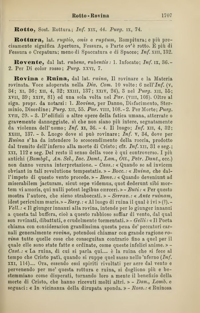 Rovina e Rnina, dal lat. mina, Il rovinare e la Materia rovinata. Voce adoperata nella Div. Com. 10 volte: 6 neWInf. (v, 34; xi, 36; xii, 4, 32; xxiii, 137; xxiv, 24), 3 nel Purg. xii, 55; xvn, 39; xxiv, 81) ed una sola volta nel Par. (vili, 108). Oltre al sign. propr. da notarsi: 1. Bovina, per Danno, Disfacimento, Sterminio, Disordine; Purg. xii, 55. Par. vili, 108.-2. Per Morte; Purg. xvii, 39. - 3. D'edifizii o altre opere della fatica umana, atterrate o gravemente danneggiate, sì che non siano più intere, segnatamente da violenza dell'uomo; Inf. XI, 36. - 4. Il luogo; Inf. xii, 4, 32; xxiii, 137. - 5. Luogo dove si può rovinare; Inf. v, 34, dove per Buina s'ha da intendere lo scoscendimento della roccia, prodotto dal tremito dell'inferno alla morte di Cristo; cfr. Infj.il, 31 e seg.; xxi, 112 e seg. Del resto il senso della voce è qui controverso. I più antichi (Bambgl., An. Sei., Iac. Dant., Lan., Ott., Petr. Dant., ecc.) non danno veruna interpretazione. - Cass.: « Quando se ad invicem ohviant in tali revolutione tempestatis. » - Bocc. : « Buina, che dall'impeto di questo vento procede. » - Benv. : « Quando deveniunt ad miserabilem jacturam, sicut sepe videmus, quot dederunt sibi mor-tem vi amoris, qui nulli potest legibus coerceri. » - Buti : « Per questo mostra l'autore, che sieno straboccati. »- Serrav. :« Ante ruinam, idest periculum maris.»-Barg. : «Al luogo di ruina il qual è ivi » (?).-Veli. : « Il giunger innanzi alla rovina, intende per lo giunger innanzi a questa tal bufferà, cioè a questo rabbioso soffiar di vento, dal qual son rovinati, dibattuti, e crudelmente tormentati.» - Gelli: «Il Poeta chiama con considerazion grandissima questa pena de' peccatori carnali generalmente rovina, potendosi chiamar con grande ragione rovina tutte quelle cose che conseguitan contrario fino a quel per il quale elle sono state fatte e ordinate, come queste infelici anime. » -Cast.: « La ruina, di cui si parla qui.... è la ruina che si fece al tempo che Cristo patì, quando si ruppe quel sasso nello 'nferno (Inf. xxi, 114)..,. Ora, essendo essi spiriti rivoltati per aere dal vento e pervenendo per me' questa rottura e ruina, si dogliono più e bestemmiano come disperati, tornando loro a mente il benefizio della morte di Cristo, che hanno ricevuti molti altri. » - Dan., Lomb. e seguaci: «In vicinanza della dirupata sponda. »- Poi?s. : « Euinosa